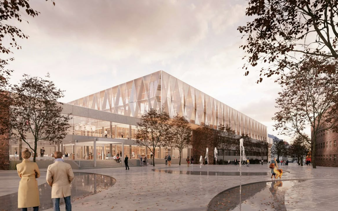 enhance and refine the uploaded architectural reference images keeping the original composition camera angle and massing improve lighting material depth and spatial clarity add subtle realism and atmospheric depth while preserving a conceptual competition style aesthetic emphasize clean urban geometry refined edges soft shadows and high quality architectural visualization maintain a minimalist color palette muted tones soft daylight balanced contrast surroundings simplified and coherent trees and greenery stylized no people no text no signage professional urban design render architectural competition board quality calm elegant contemporary