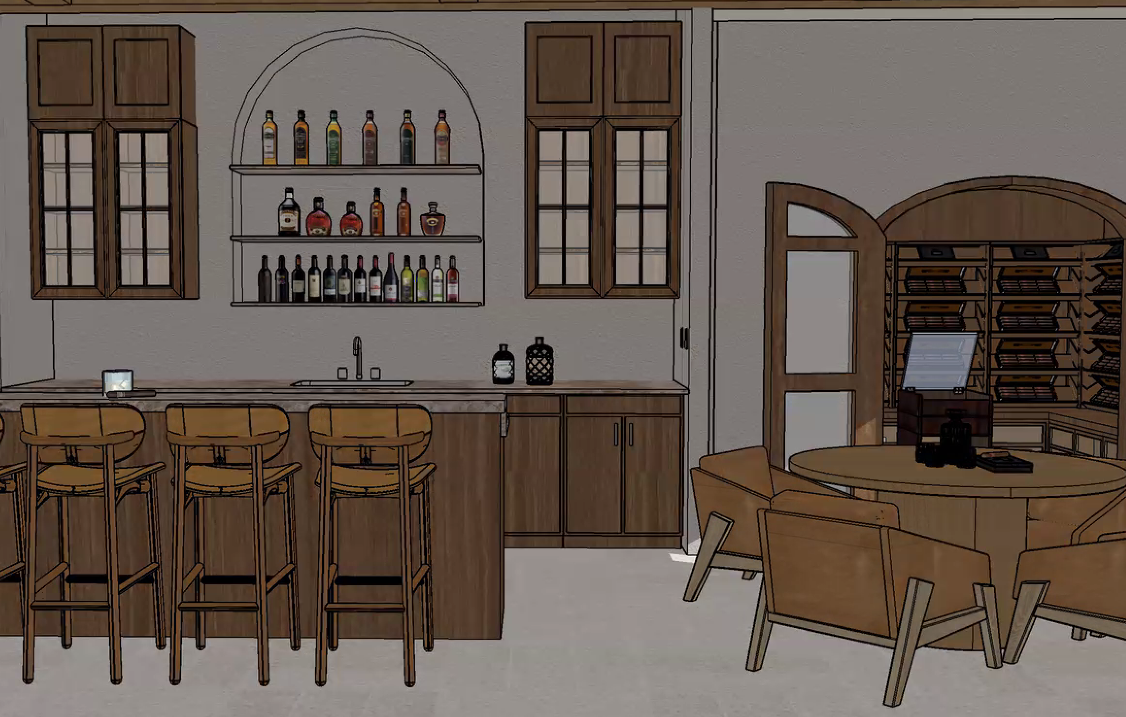 render an elegant vintage bar and cigar room with dark brown coffered ceiling