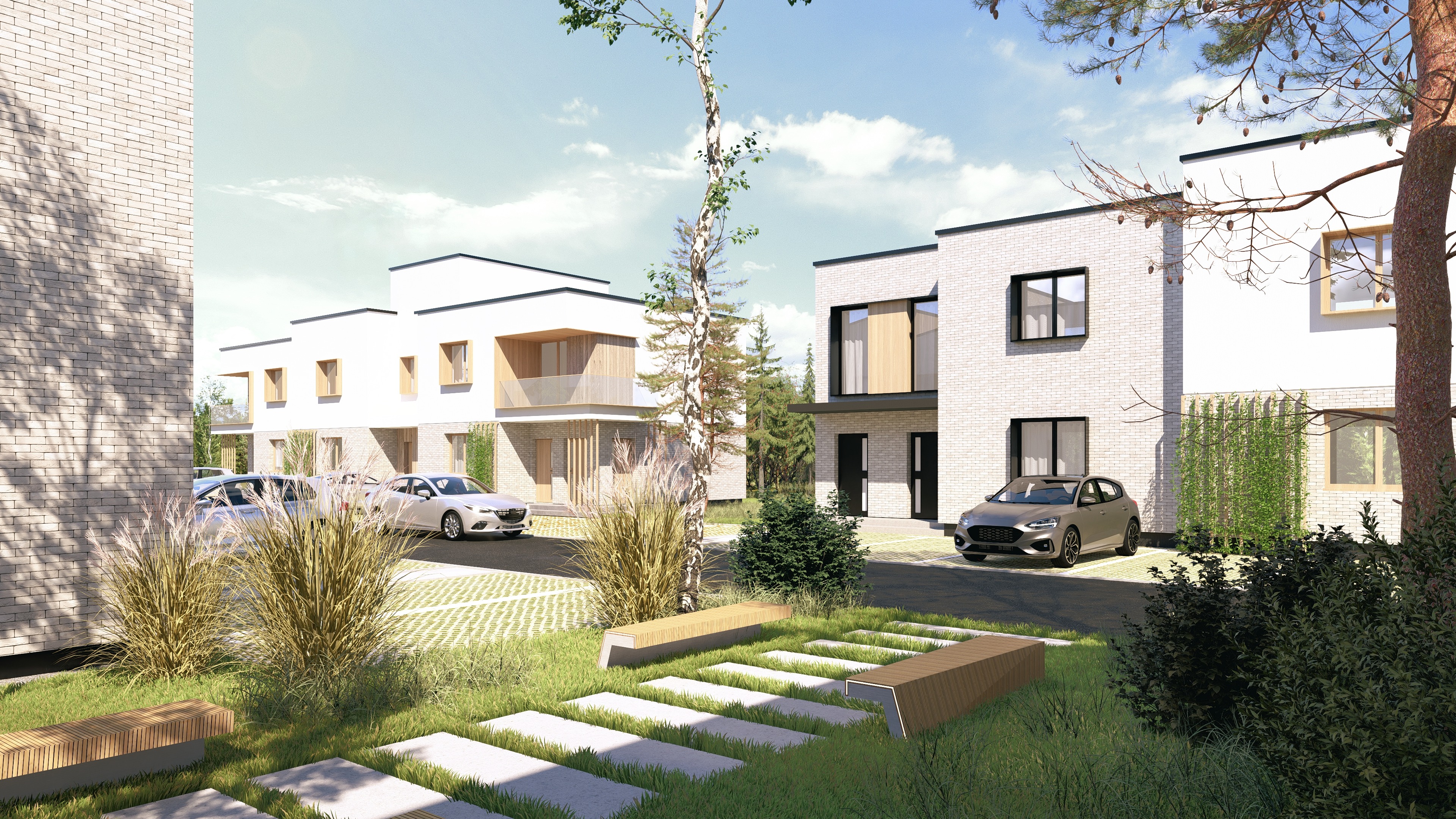 photorealistic architectural render of a modern residential building created strictly based on the provided 3d model preserve the geometry 1 1 maintain the exact building massing proportions fa ade layout openings architectural details and camera perspective absolutely no changes to form scale or framing style ultra realistic architectural visualization cinematic high end high quality pbr materials realistic brick natural wood fa ade cladding metal elements with subtle patina glass with physically accurate reflections and light refraction material realism with preserved color values enhance material realism through surface detail texture resolution micro roughness normal maps and physically based shading while keeping the original material colors unchanged all materials must retain their existing hue saturation and brightness as defined in the source model and reference images no color shifting no warming or cooling of tones no reinterpretation of albedo values realism should come exclusively from texture detail and light interaction not from color alteration lighting realistic daytime lighting in midday conditions neutral daylight with high sun position soft side lighting realistic global illumination gentle light shadow contrast warm interior lighting visible through windows sky and clouds realistic daytime sky with natural color gradient soft blue tones and physically accurate cloud formations light cumulus or thin stratocumulus properly scaled and consistent with midday lighting no dramatic or stylized skies vegetation highly realistic plants with natural variety in species size and color trees shrubs ornamental grasses and ground cover appropriate to a contemporary residential environment correct botanical scale natural growth patterns and subtle irregularity no repetition or artificial symmetry context elements minimal and realistic surrounding elements such as parked vehicles modern neutral colored cars pathways curbs and small urban details all context elements should be correctly scaled unobtrusive and serve only to enhance realism and sense of scale without distracting from the architecture or altering the composition mood atmosphere elegant calm luxurious slightly cinematic premium residential feeling quality ultra sharp focus physically correct lighting realistic shadows natural color grading high dynamic range no noise no blur no artistic stylization clean pure photorealism comparable to top tier competition and developer architectural visualizations 8k ultra detailed professional architectural render