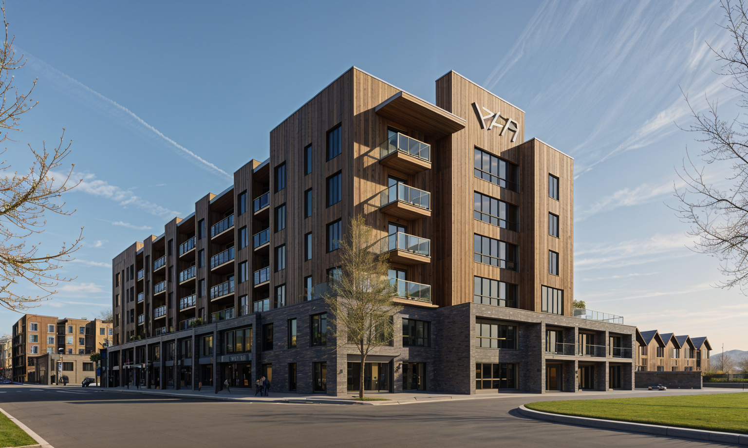 render this 6 storey multi family building in a west coast contemporary style keeping all existing geometry proportions and massing exactly as shown express the shift entirely through materials tone and detailing not form use a sophisticated natural palette inspired by the pacific northwest warm wood accents cedar or hemlock charcoal and graphite toned metal panels smooth fiber cement or stucco in complementary neutral greys and black framed glazing introduce vertical material differentiation to break up the scale alternating between darker metal cladding and lighter neutral panels for depth and rhythm ground the building with darker more textured materials such as concrete or masonry to create visual stability while upper levels use a mix of lighter greys and warm wood tones to balance contrast and warmth maintain clean lines minimalist detailing and a high quality modern aesthetic lighting should be natural and balanced emphasizing the texture of wood and metal and the vertical articulation of the fa ade the overall effect should feel distinctly west coast contemporary refined warm and cohesive while preserving the original architecture and massing architecture