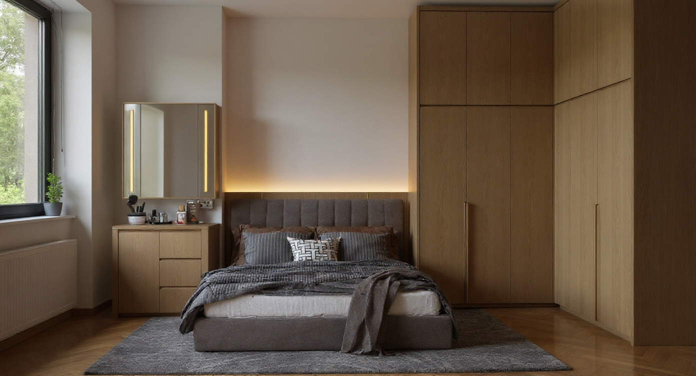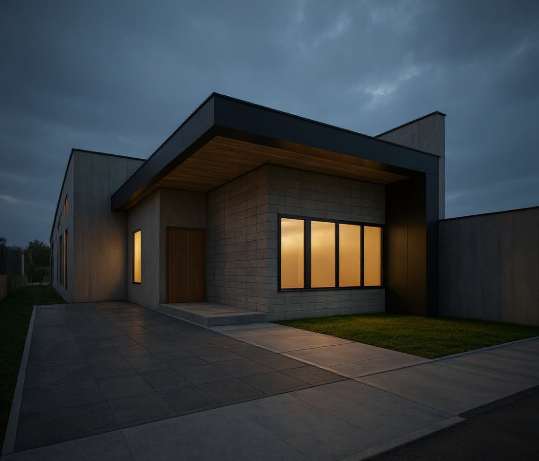 reate a hyper realisticmidday render of the exact building design shown in my drawing do not change any architectural details proportions or composition the structure is a single story modern home with a flat roof clean geometric lines and a combination of concrete beige tile and dark cladding keep the same layout windows and entrance placement use cinematic midday lighting with a soft blue sky fading into warm golden interior light visible through the windows highlight material textures realistically smooth concrete walls dark trim subtle reflections on glass and natural light shadows on the ground tiles include a faint lawn area with soft lighting gentle reflections and ambient shadows for realism the mood should be calm modern and photographic a magazine quality image that looks true to the original drawing just brought to life with realistic depth lighting and texture