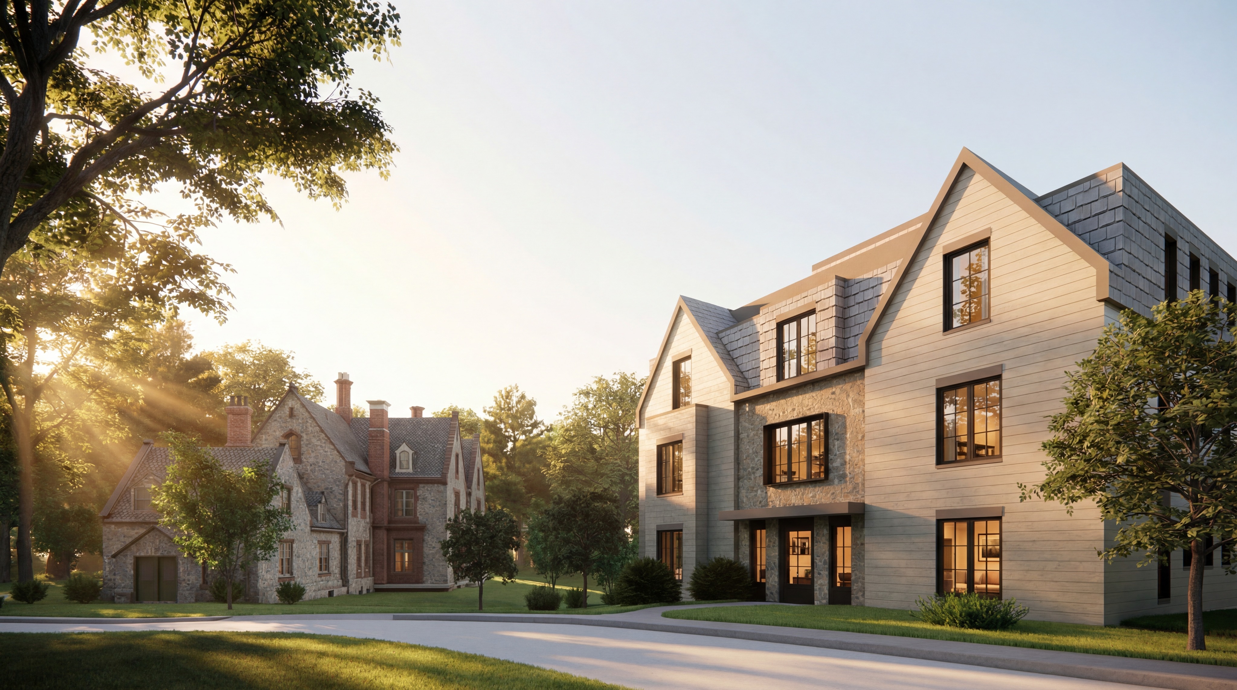 make the flat building on the right all stucco with limestone veneer in the gables