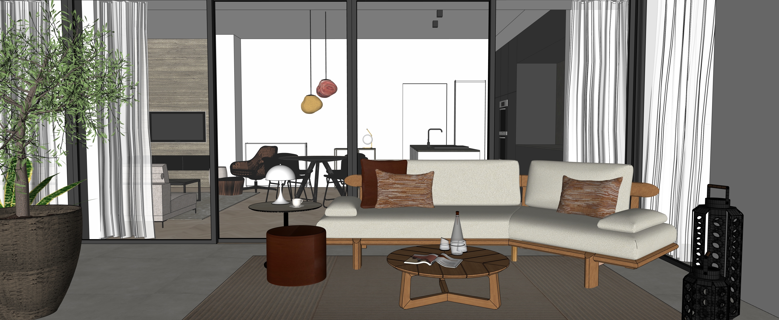 realistic terrace with natural warmer daylight pouf and pillow in brown velvet flower pots in dark grey with structure realistic background clear water bottle and glasses table lamp is slightly on lamps inside are off keep textures and proportions