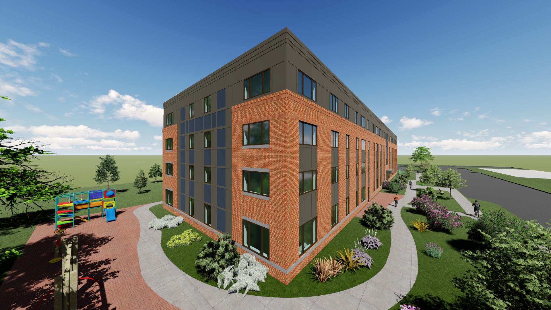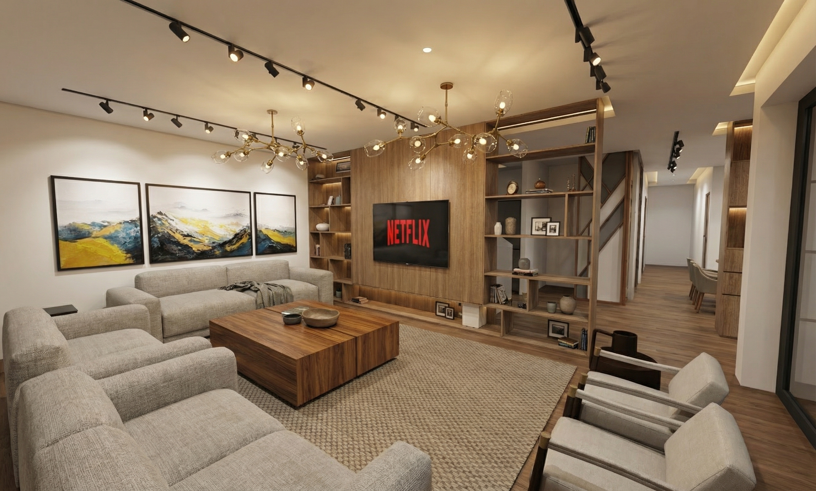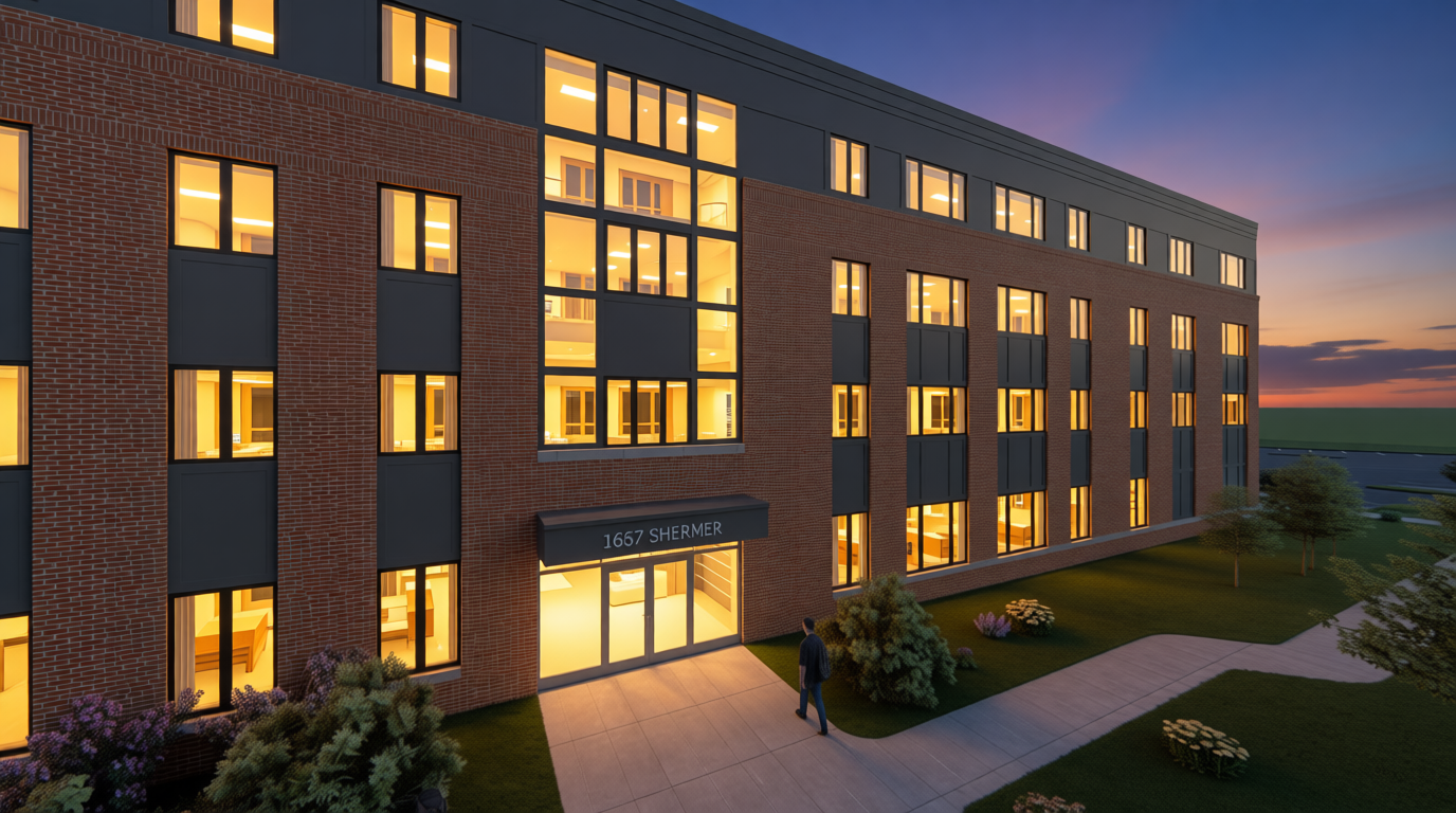 merge this image with previous and rotate view to face long front elevation more create twilight rendering from this image with illuminated windows with sunset light on this south elevation