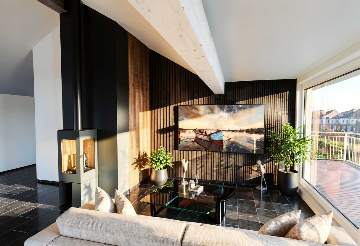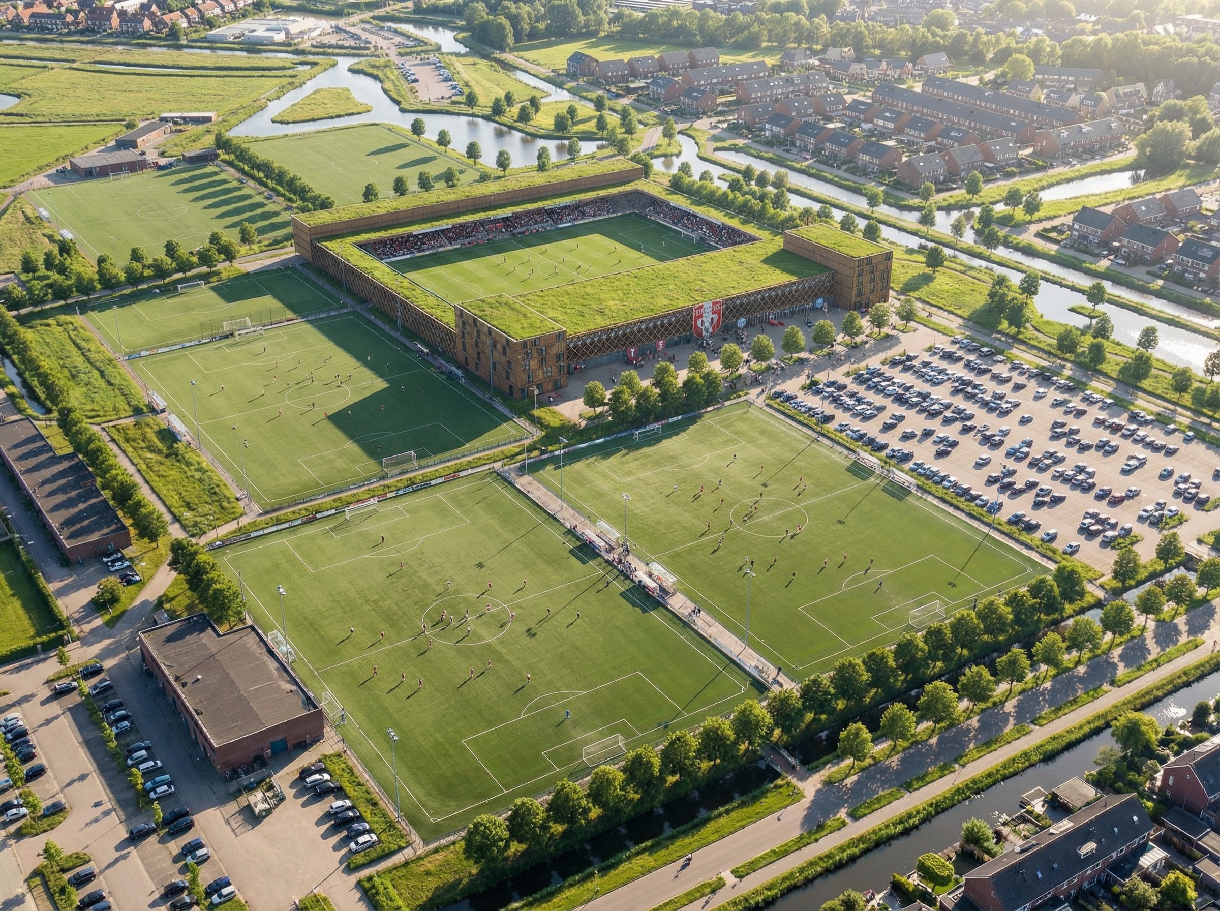 add the text samen nieuwe energie cre ren to the left side of the building on the left wooden outside facade make this text white keep the rest of the picture the same