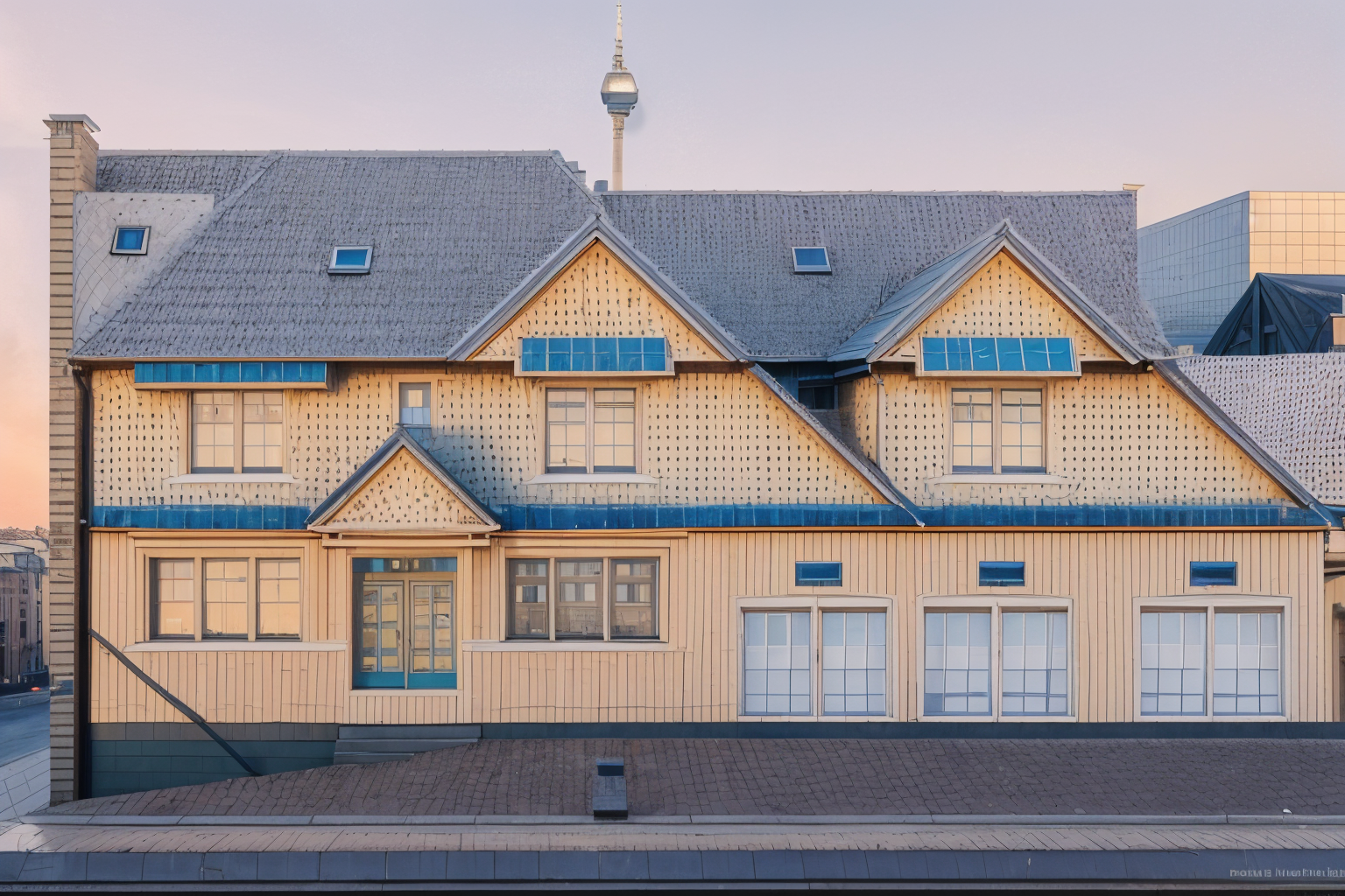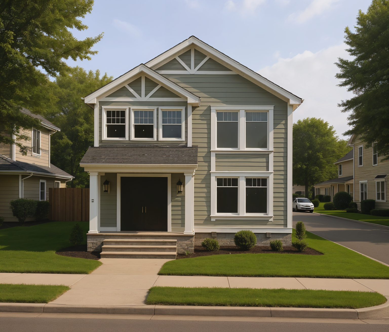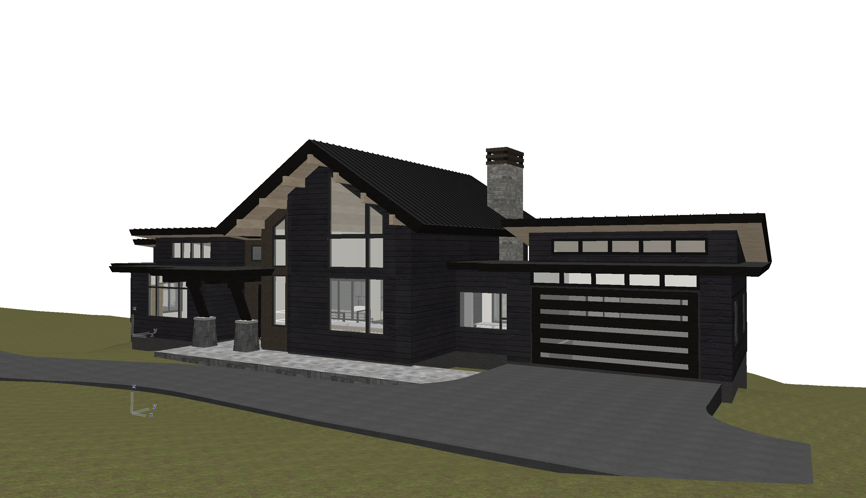 watercolor render of modern home in a forrested setting with landscaping around the house and driveway architecture