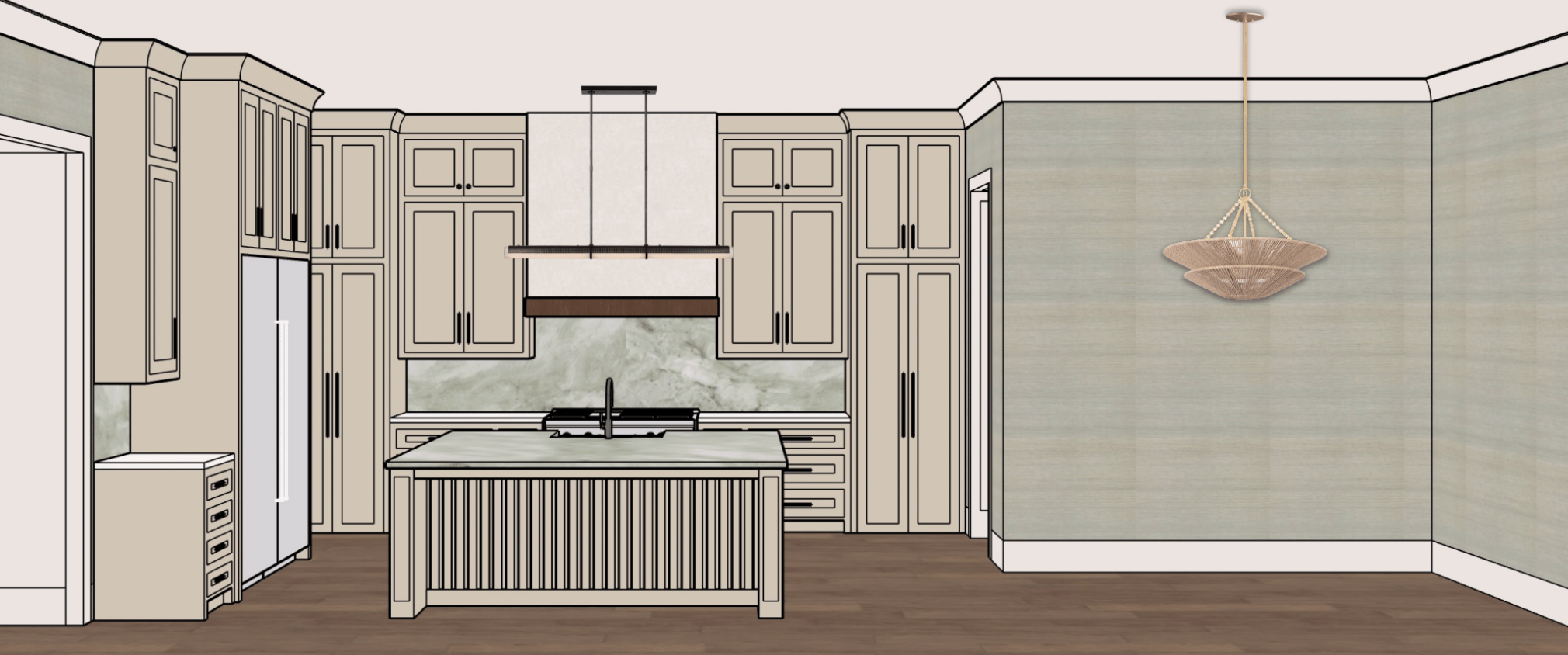 change the range hood to be the same shape but made from antique brass with antique brass strapping change the light hanging over the island to be three industrial cloche pendant in antiqued brass found at https www arhaus com products industrial cloche pendant in antiqued brass variant 40869224382635