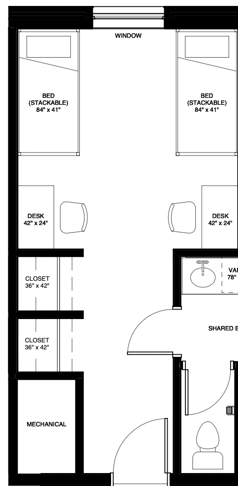 convert this floor plan into a realistic isometric 3d view of a full house show the space from an elevated angle with furniture walls and details visible create a 3d image of a modern dorm room with dark grey carpet floors and white walls make the bed frames and desks a light oak color loft the beds and put a black futon under one and a mini fridge and drink snack cart under the other put white curtains to cover the closet put the beds where the desks used to be and put the desks on the opposite side of the beds use the same furniture as shows on the plan do not change the orientation of the floorplan