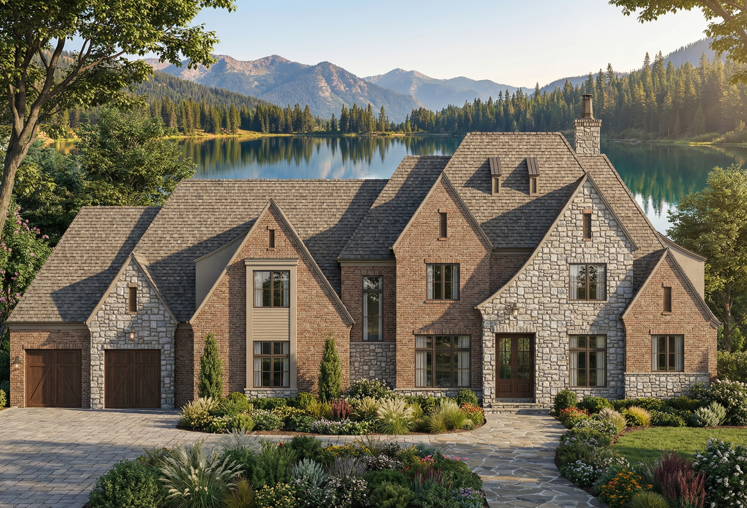 exterior shot apply a pale stacker stone to the pillars at the bottom of the posts as well as the area around the front door do not change anything else architecture