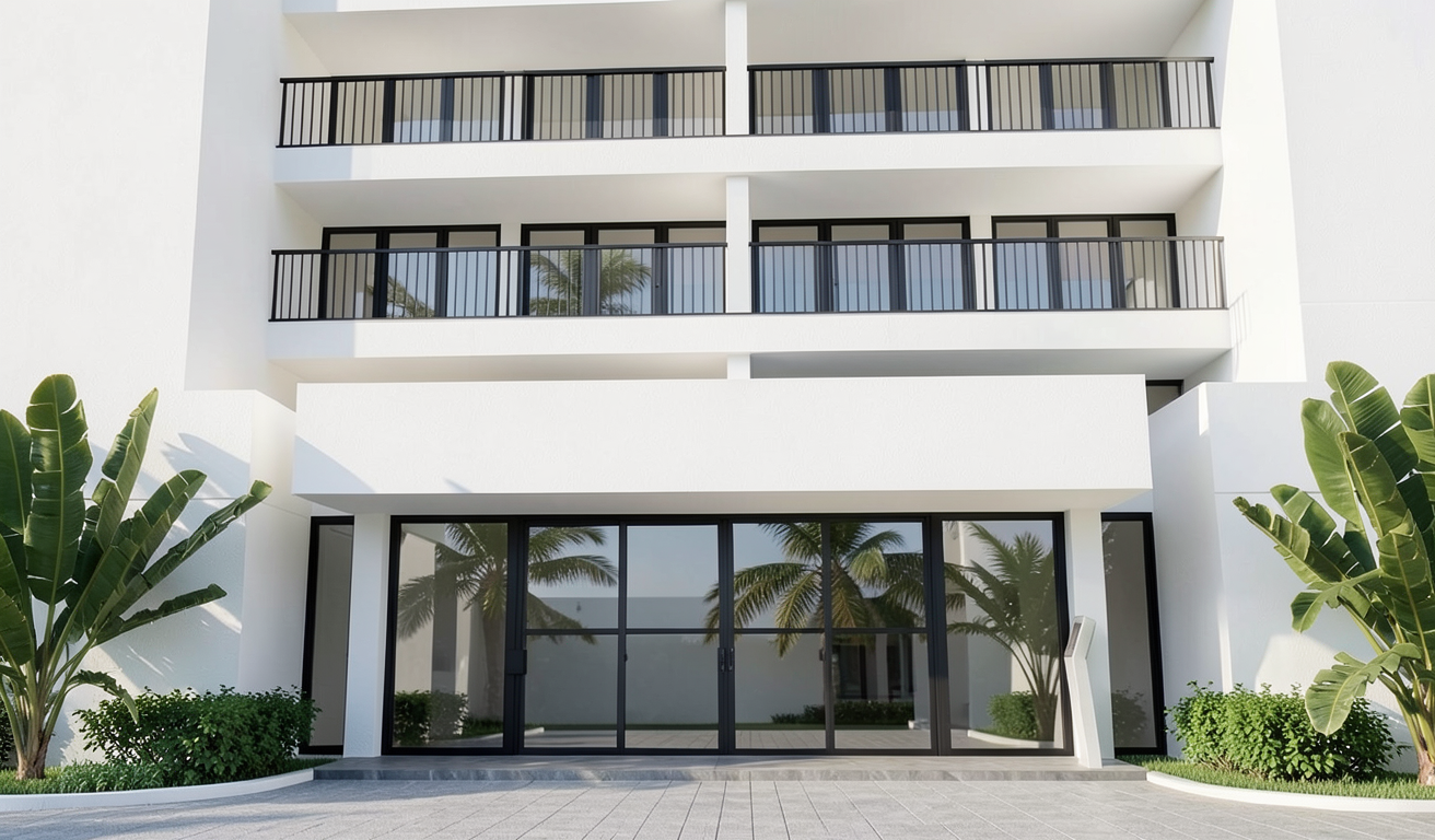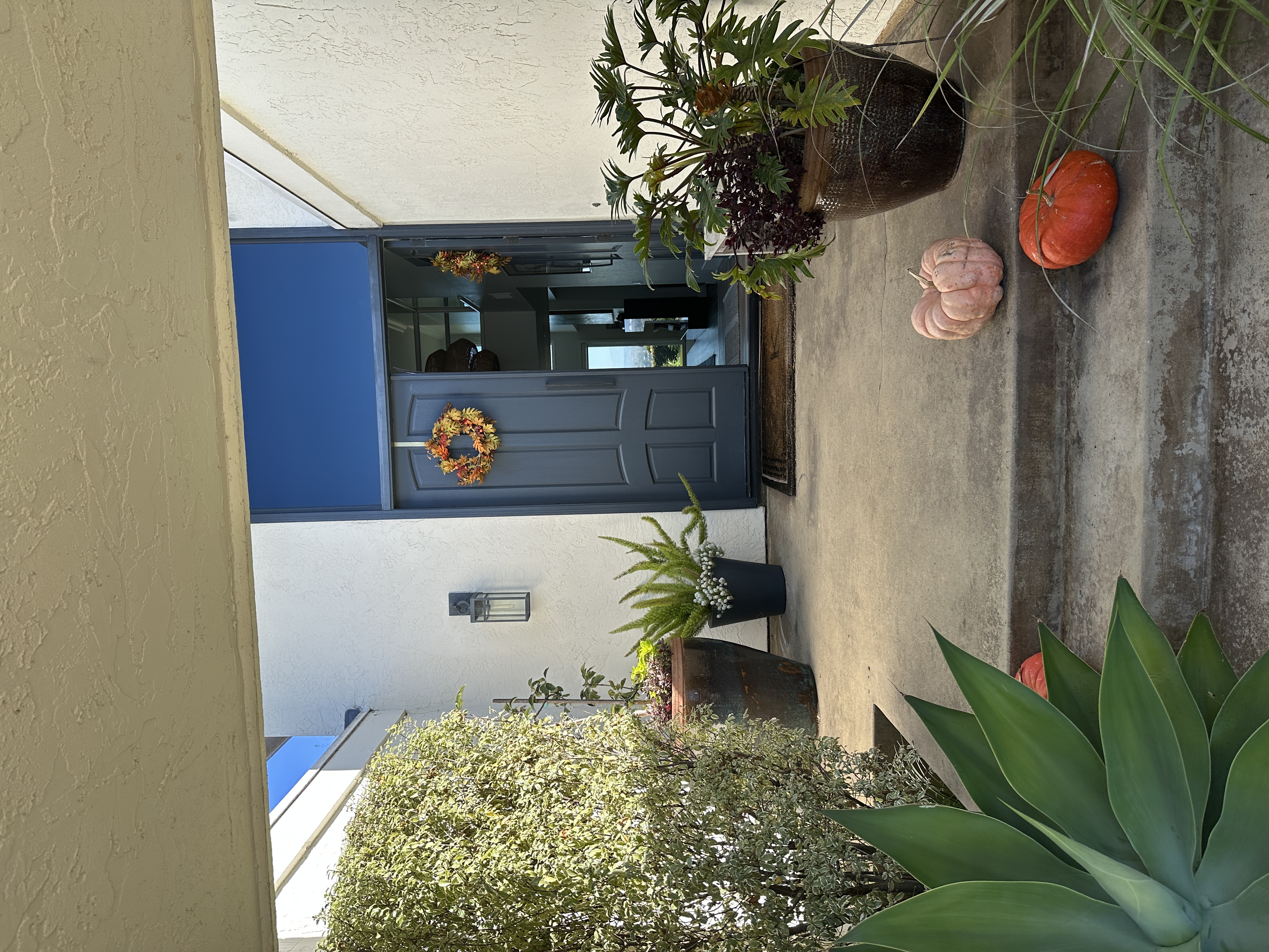 remove the patio plants and shrubs add charcoal flagstone over the concrete patio replace the front doors with black gridded glass french doors