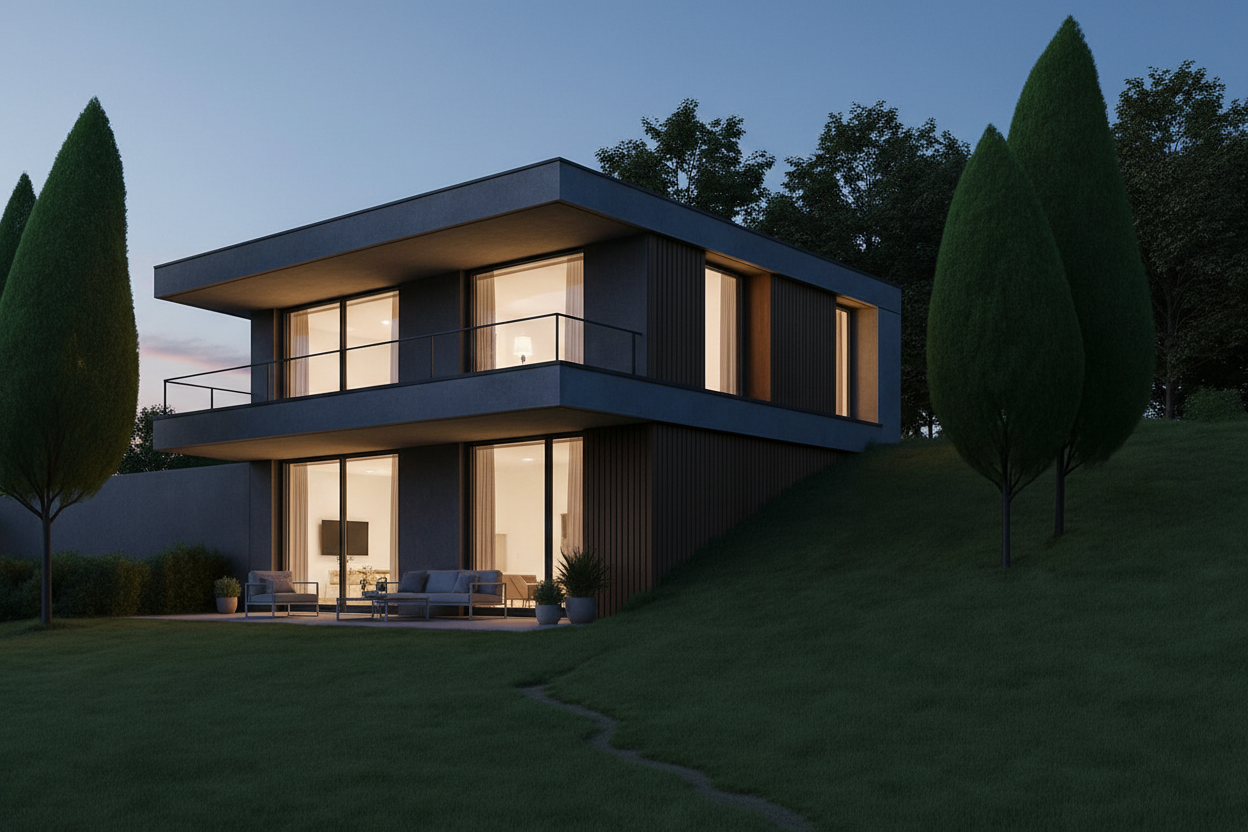 make it even darker time of the day stars in the sky fog in the foreground people inside the building and on the terrace