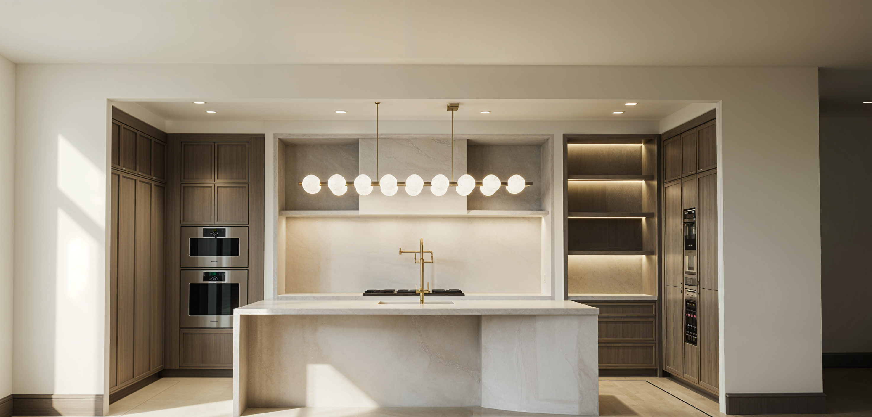 enhance the image to feel like a professionally photographed luxury real estate interior this is a bright condo with abundant natural light primary lighting should come from large windows on the left side of the space from the viewer s perspective behind and to the left of the camera use soft natural daylight as the dominant light source light should enter from the left side windows and wash across the kitchen create gentle highlights on the left facing surfaces and soft shadows falling to the right maintain balanced exposure with no blown out windows or harsh glare light should feel diffused and slightly warm not stark or overly cool interior lighting should remain subtle and secondary decorative fixture and under shelf lighting should softly glow without overpowering daylight maintain a natural layered lighting effect all materials must read true to life wood should show authentic grain tonal variation and a natural matte finish stone should display real depth soft movement and correct surface finish metals should have accurate reflectivity with soft slightly imperfect reflections painted surfaces should have smooth even coverage with realistic light falloff add subtle imperfections to avoid a computer generated look slight variation in wood tone and grain direction soft edge rounding on cabinetry and stone natural shadow gradients in corners and under cabinetry light ambient occlusion for depth reflections should be physically believable especially on appliances stone and metal finishes maintain correct scale and proportion with no lens distortion and straight vertical lines the final image should feel calm warm refined and believable like a real naturally lit condo interior photographed during the day