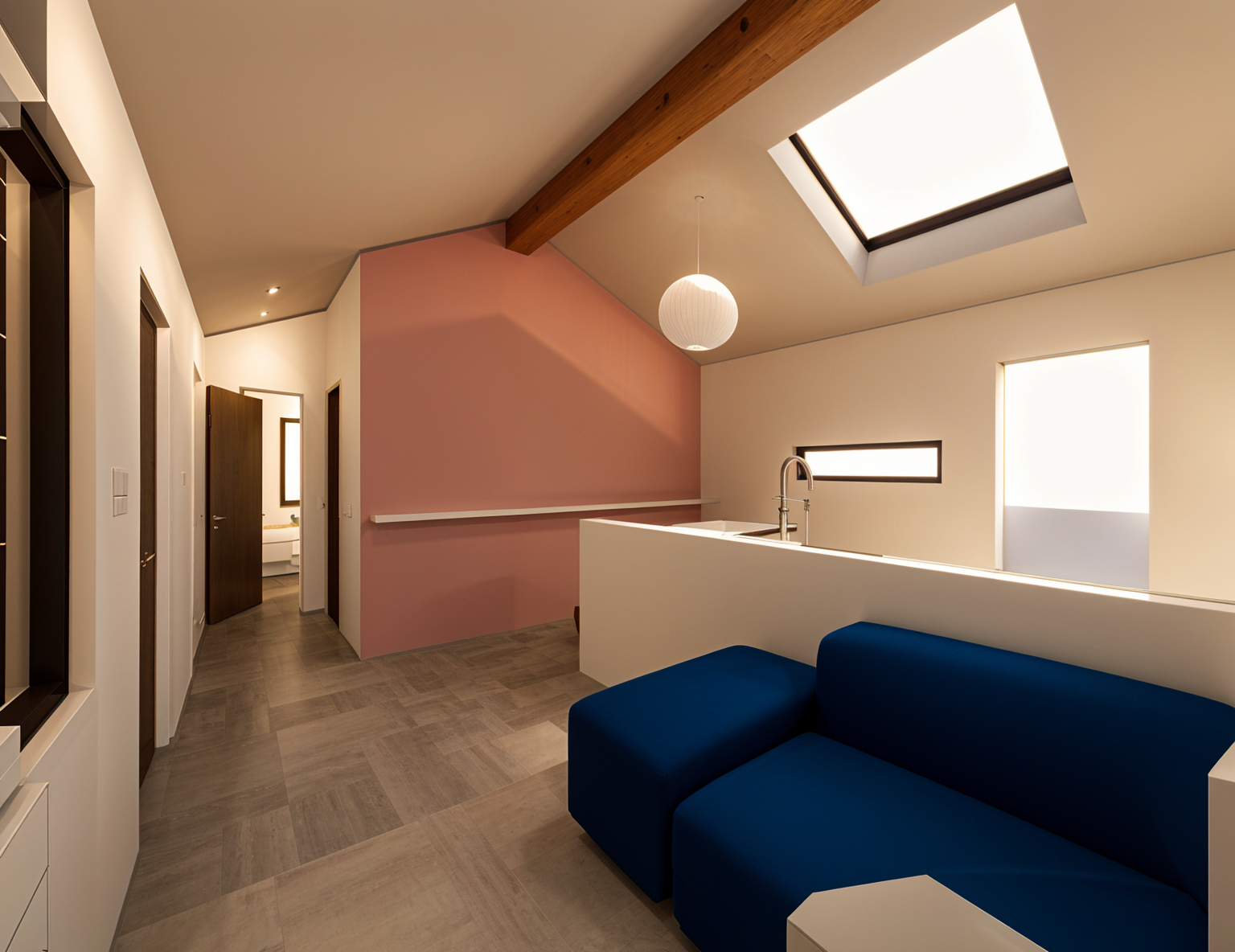 include natural lighting clean up the countertop add a picture in the opening on the wall stage the countertop remove the cardboard boxes on the wood top