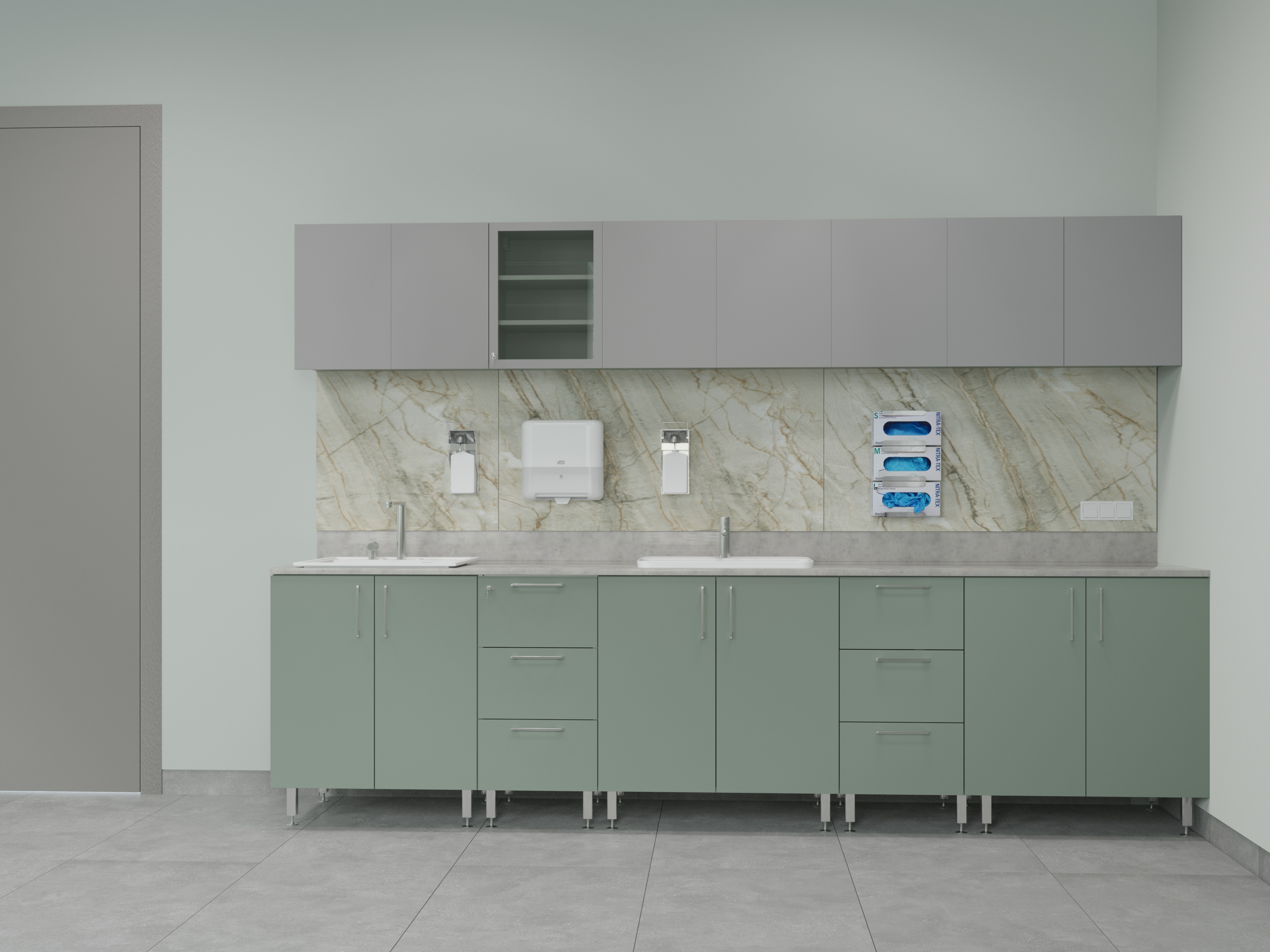 improve visualization quality by creating a photorealistic image of the medical furniture in sage and gray lower cabinets are matte sage while upper cabinets remain gray improve daylight quality and make textures appear more realistic do not change shapes or furnishings