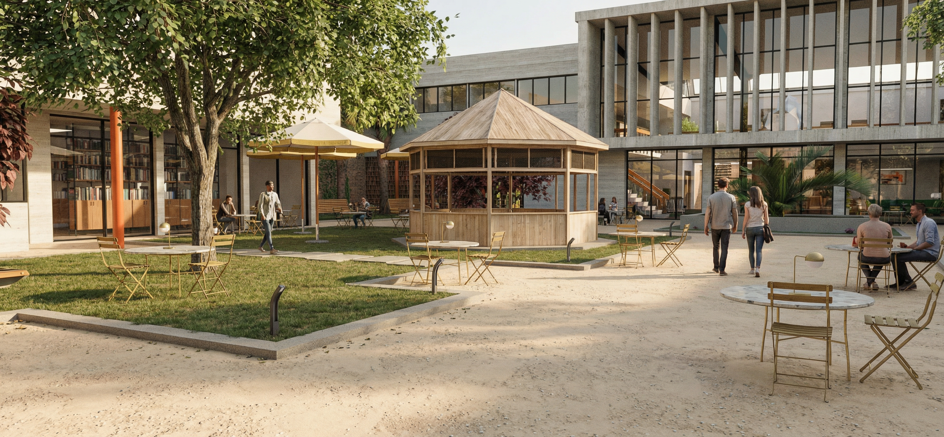 grainy watercolor render of timber frame building with reclaimed wood siding and stone wainscot watercolor trees and urban environment in the background extensive watercolor landscaping surrounding the building