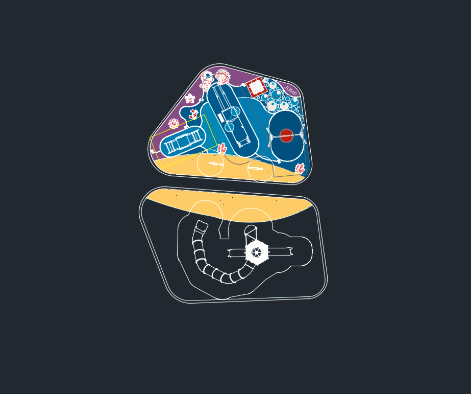 create a top view epdm playground flooring design plan for the lower zone of a playground designed for children aged 6 12 inspired by traditional uae pearl diving culture the playground area is an organic irregular shape similar to a landscape plan the epdm flooring uses deep ocean blues and turquoise tones to represent underwater depth with a sand colored shoreline strip along one edge representing the seabed the flooring design should create an underwater exploration route across the play area with interactive graphics suitable for older children a curving trail of bubbles forming a movement path across the playground several large pearl circles that act as jumping or stepping targets a minimal outline graphic of a pearl diver swimming toward an open oyster with a pearl coral reef shapes placed around terrain mounds flowing seaweed graphics along the borders of the play area scattered shell and starfish outlines integrated into the epdm the composition should feel like an underwater treasure discovery landscape encouraging children to move across the space style should look like a clean landscape architecture playground plan rendering with clear epdm color zones smooth organic shapes and graphics suitable for epdm inlay installation avoid childish cartoon style keep graphics bold simple and readable in plan view