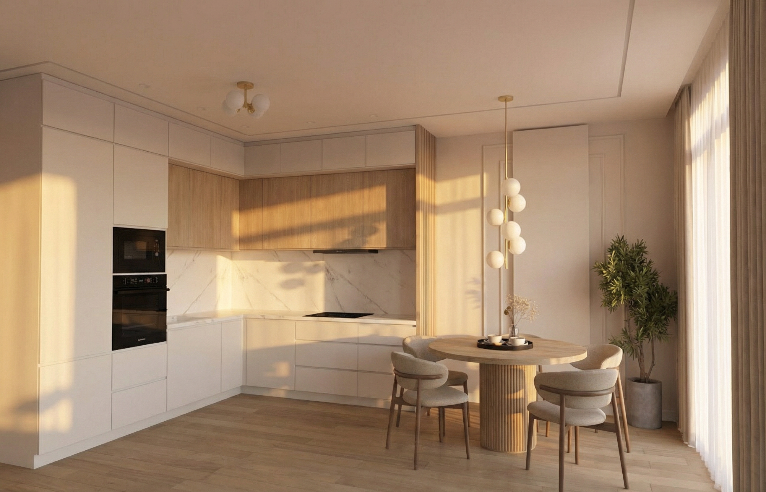 render a cozy space with natural light from the windows the bed and the ones in front where outside can be seen a beautiul well kept garden with a driveway with one car in it the bed itself is a cream colored with cream white and a light brown cover that gives off a homey feeling with dark wood behinde the bed that gives off a seren feeling as well as beige side tables that compilamnts the spave as well as a cream rug that has a uniqe design that gives off elegant vibes the hole room gives of vibes of a elegant minimalist design with some books in the side as a decore but keep the same design in everything