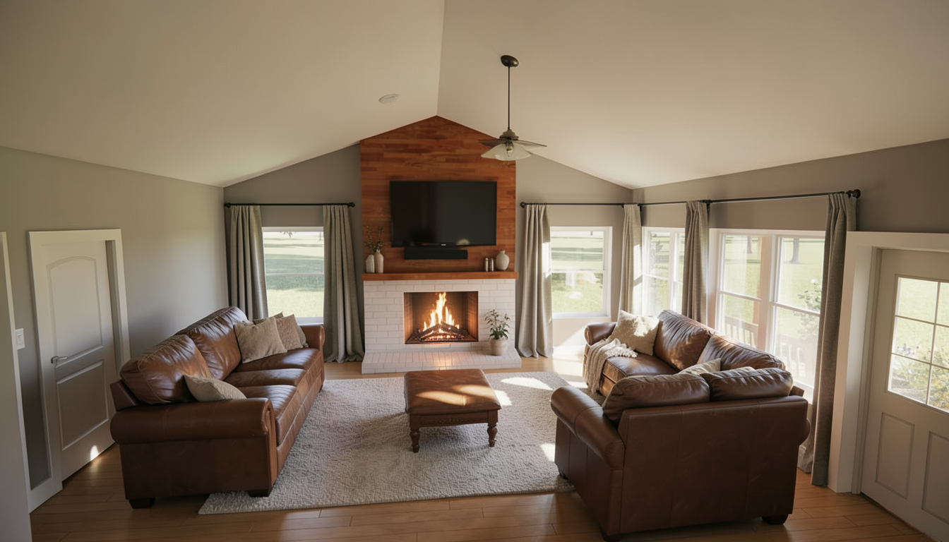 you are a professional rendering service offering the highest quality renderings in the world render this living room with furnishings curtains on the windows a tv above the mantle and a fire in the fireplace keep all windows as they are where they are only one sage green accent wall behind fireplace stage with furniture