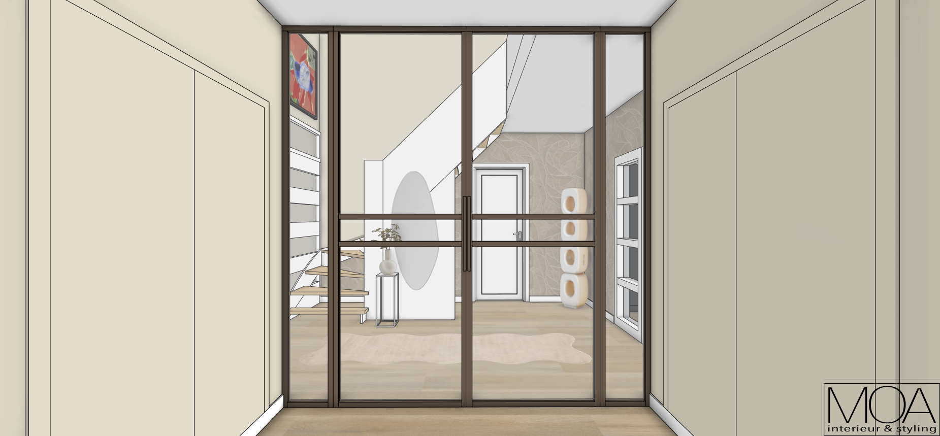 bright daytime render bronzed frame doors