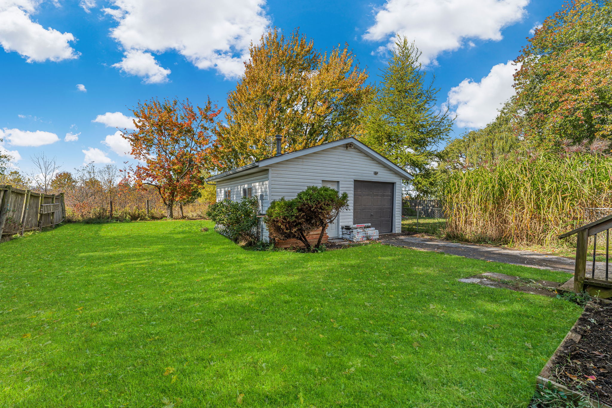 remove stacked wood and stacked shingles in front of building