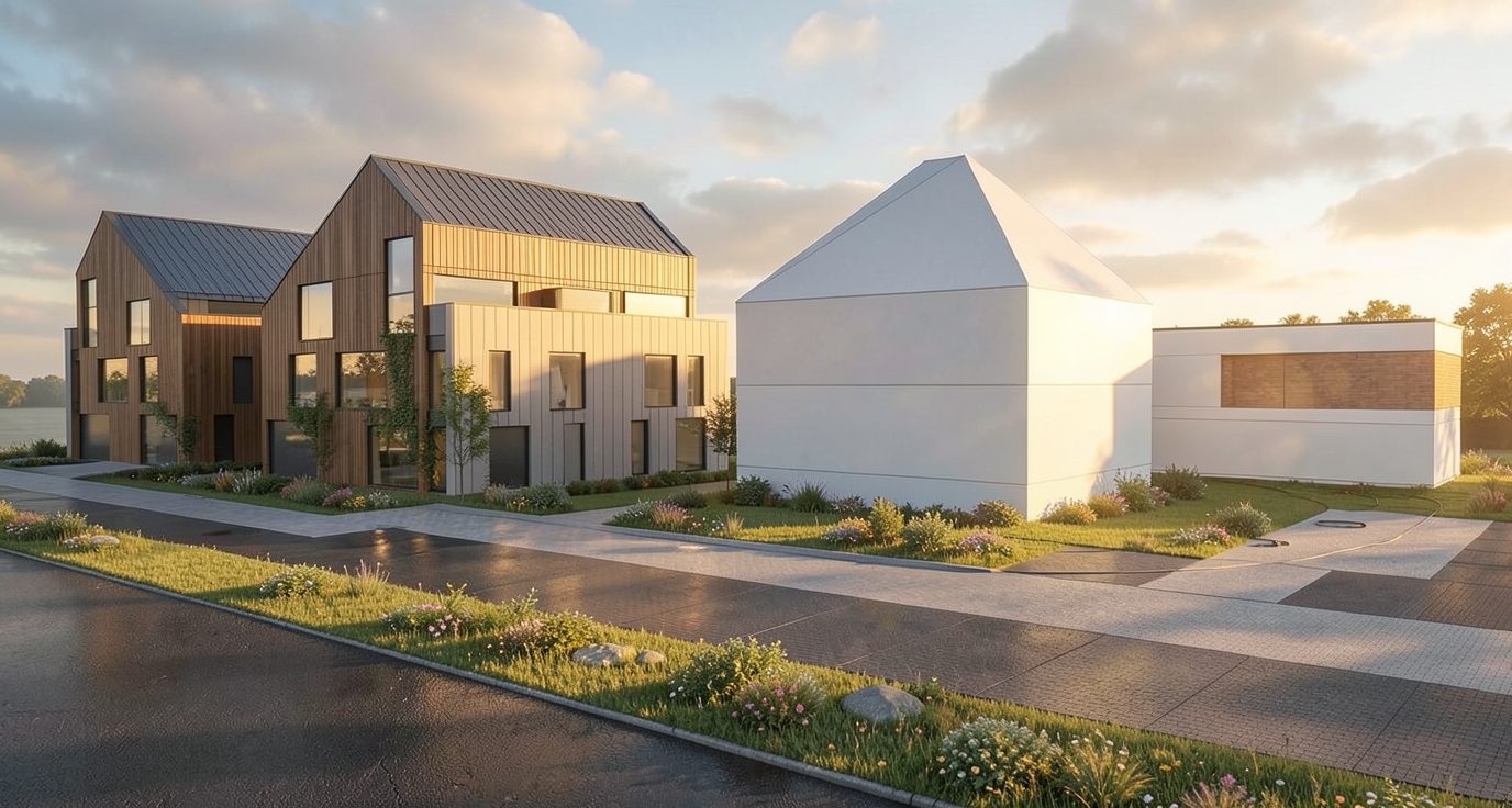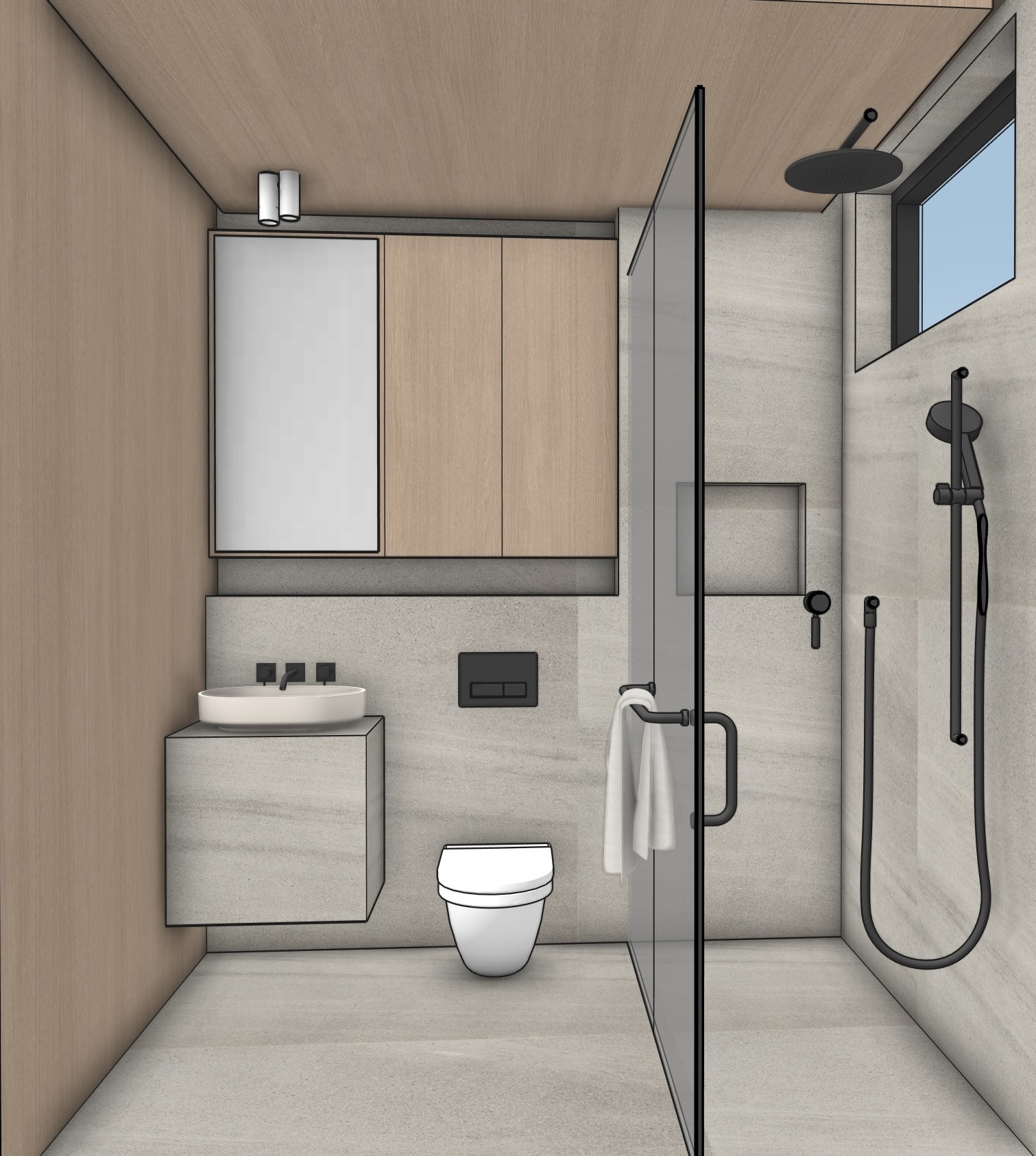 a modern bathroom featuring a sleek minimalist design light wood paneling covers the ceiling and left wall complemented by smooth light gray tiles on the right wall and floor reflecting soft natural light the shower area has a clear glass partition contrasting with elegant matte black fixtures a floating vanity with a circular white sink and black hardware sits beside a wall mounted cabinet with light wood doors and a frosted mirror the atmosphere is serene and contemporary highlighted by a white ceramic toilet and a neatly draped white towel on the glass door handle