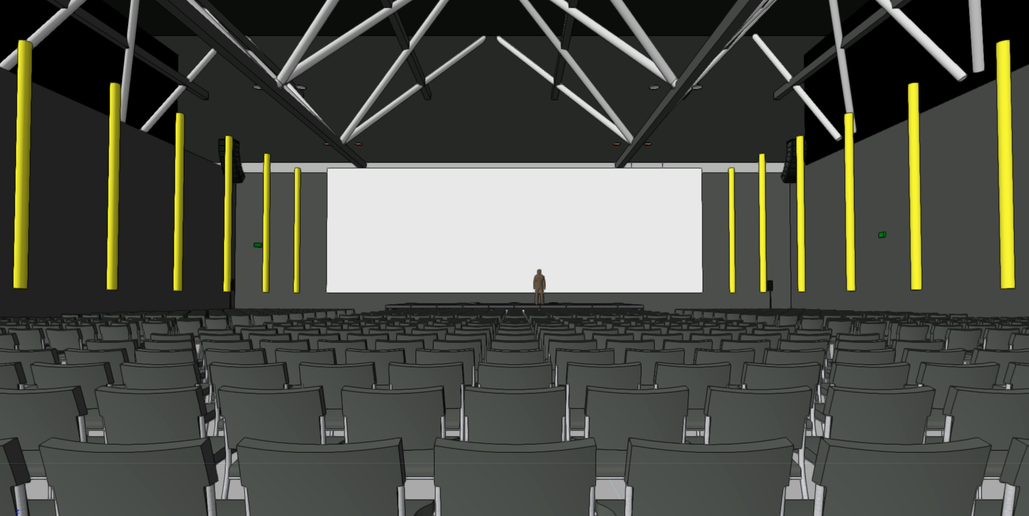 a speaker stands on stage in a dark immersive stage environment that has a glowing white led screen with illuminated yellow beams of vertical light