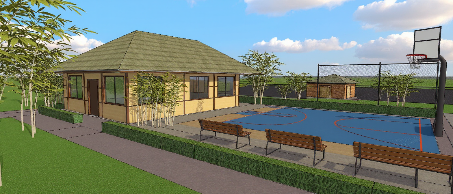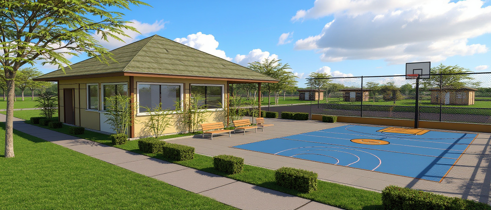 sunny weather flat roof building blue color with windows in front of car parking some green bushes