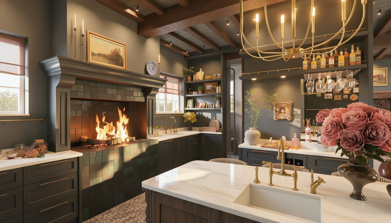 buildings set in naturally sloped hill carriage house with dormers old stone farmhouse with windows tall grass hill foreground fog trees in background
