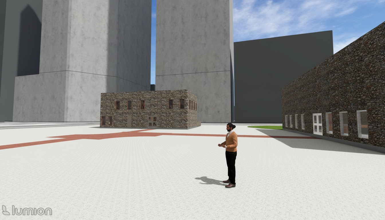 render this view while keeping the exact same composition camera angle proportions aspect ratio and all existing elements do not change or modify the geometry layout scale background landscape or objects preserve the image exactly as it appears but enhance it by applying realistic materials to all visible surfaces use cmu block texture for the screen wall tpo pvc membrane material for the roof with accurate seams and reflectivity and grass textures for ground surfaces maintain all other elements exactly as shown producing a high quality rendering that only adds material realism without altering any other aspect of the scene