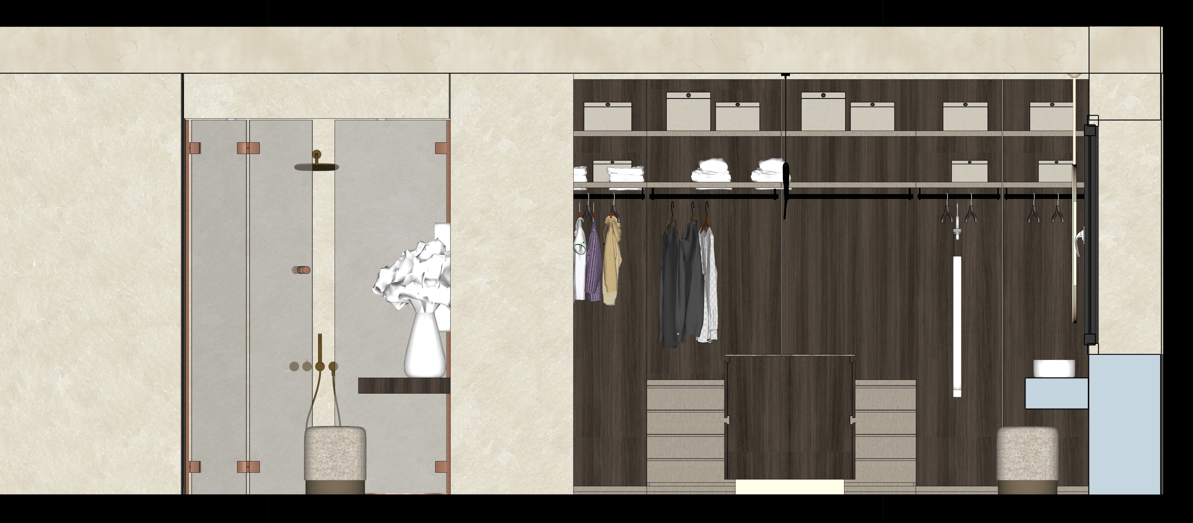 perfetto ecco il prompt completo pronto da copiare prompt eng front elevation architectural render orthographic view no perspective strictly preserve the original image composition maintain exact geometry proportions alignment spacing and dimensions all walls openings glass partitions furniture wardrobe elements and accessories must remain identical to the input do not move scale rotate redesign simplify or reinterpret any element do not add or remove objects glass shower enclosure must remain transparent and clearly layered with very subtle transparency minimal reflections no mirror effect no opacity and sharp clean edges maintain visibility of elements behind the glass no blur no distortion maintain exact wardrobe geometry and internal organization clothes shelves drawers and accessories must remain unchanged and precisely aligned no reinterpretation preserve all materials textures colors and finishes exactly as they are do not change tones or design enhance realism slightly without altering identity walls more tactile wood with deeper grain fabrics softer and more volumetric metal details slightly more defined use soft warm lighting around 3000k 3500k with gentle highlights and subtle light gradients avoid flat lighting while keeping shadows soft and controlled add subtle ambient occlusion and light shadow definition to improve depth white background only no environment no exterior context clean minimal orthographic architectural render high resolution warm and refined atmosphere no artistic reinterpretation