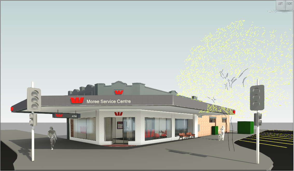 render a modern bank service center with the street scape of yass nsw australia on a sunny day the building features sleek white brick walls and large reflective glass windows the signage is a vibrant red include a dark gray roof and a detailed atm area the surrounding pavement is a concrete gray while the traffic lights are as per austraian standrad illustrate a tree with bright green leaves creating a lively and inviting atmosphere add subtle realistic shadows to enhance depth and detail there are public roadside carpark are to the right side road and main street is the left side road
