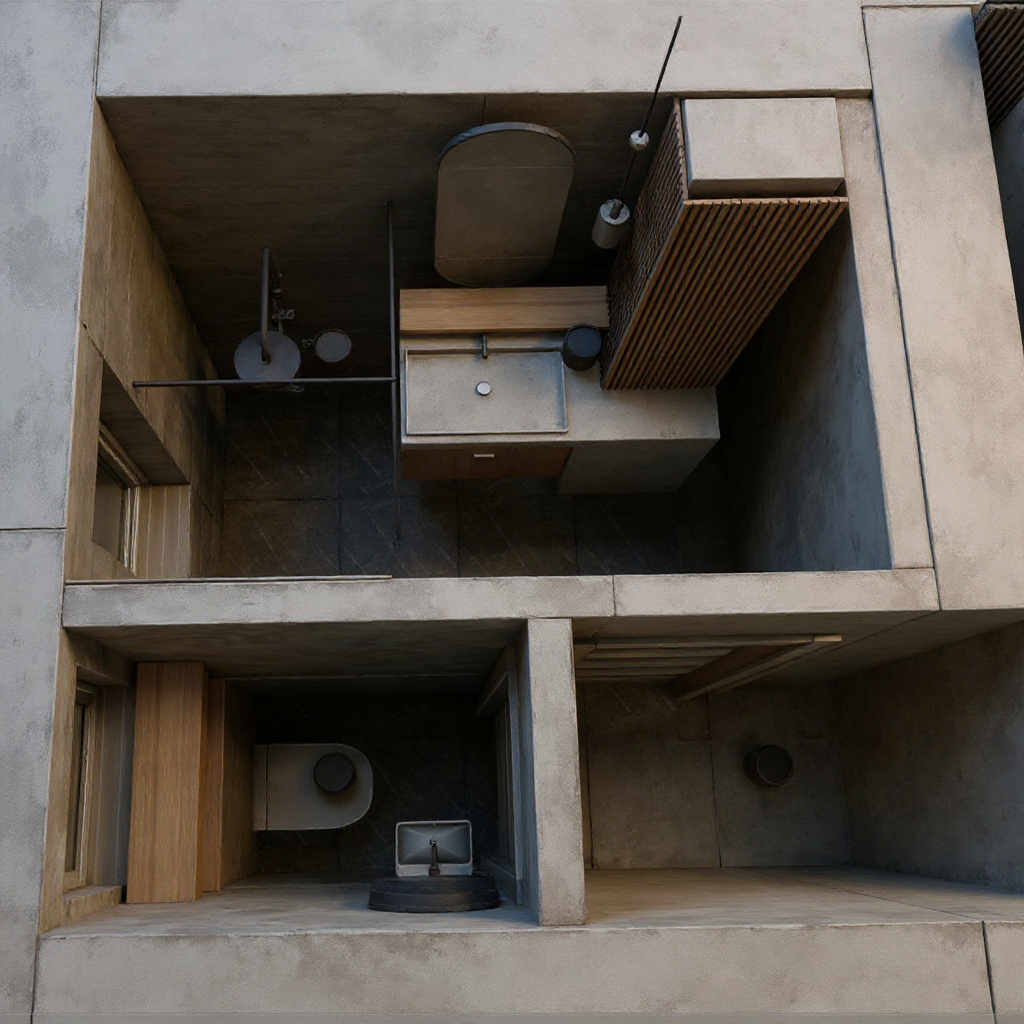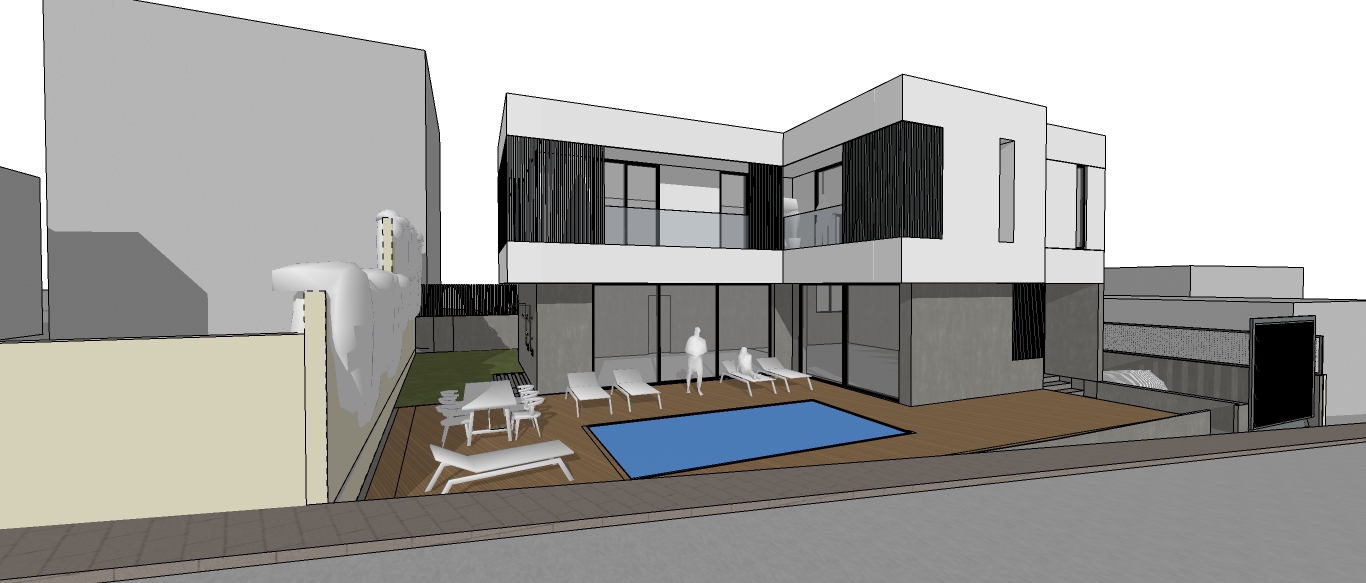 make a render of realistic environment in the yard the brown around the pool only to the visible limits is wooden the white features are enscape elements people sunbeds and on the wall on the left side wall vegetation dont add people and the people that are in the image make them realistic