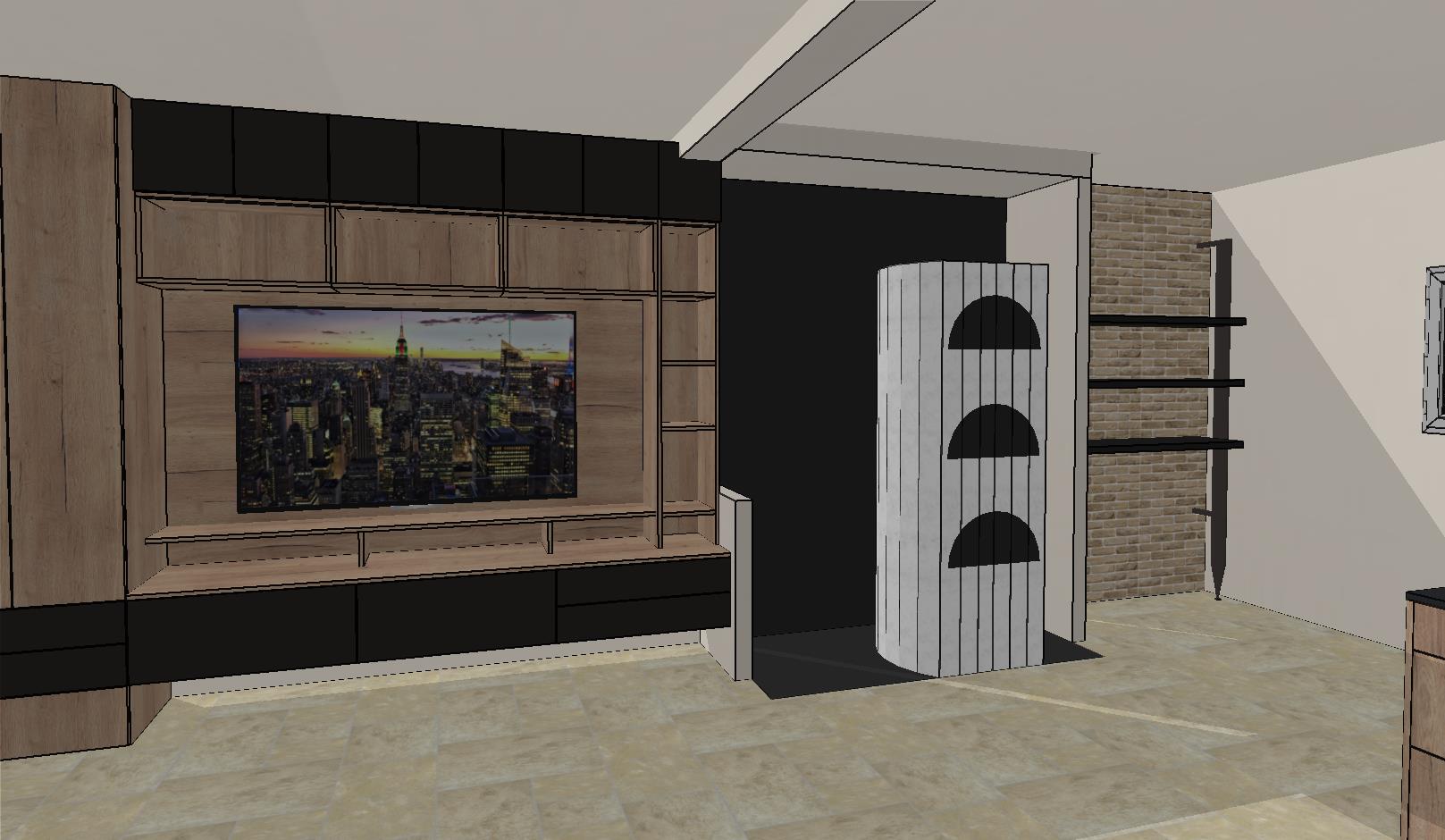 ajoute des buches de bois sous les tag res noires droite de l image et ajoute de la d coration et de l clairage dans le meuble de gauche conserve les couleurs et textures initiales