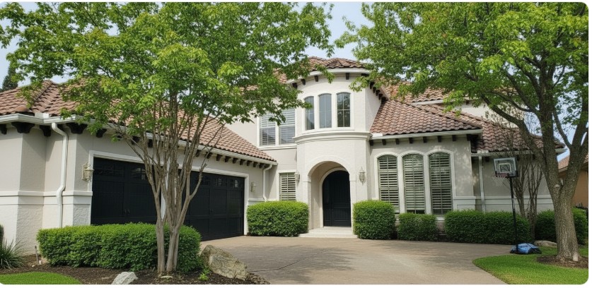 apply exterior finishes using the uploaded reference swatch for accurate color matching convert all stone surfaces into a smooth stucco plaster finish and paint them in sherwin williams colonnade gray sw 7641 the stone should no longer appear as natural stone it should read as a continuous stucco surface matching the rest of the house no visible stone pattern or color should remain paint all existing stucco surfaces in sherwin williams colonnade gray sw 7641 ensuring a consistent warm greige tone across the entire facade the color must match the uploaded swatch and remain warm not cool or blue all trim fascia soffits gutters and downspouts should remain sherwin williams minimalist gutters must not be painted black paint only the dentil molding roofline teeth in benjamin moore onyx do not extend black onto fascia or gutters garage door benjamin moore onyx front door black replace all wall sconces with modern vertical bronze fixtures slim rectangular warm led glow update landscaping to lush summer conditions with green grass full trees and manicured shrubs use warm natural lighting late afternoon sunlight do not change architecture or proportions maintain realistic shadows and matte finishes ensure a seamless transition between former stone areas and stucco