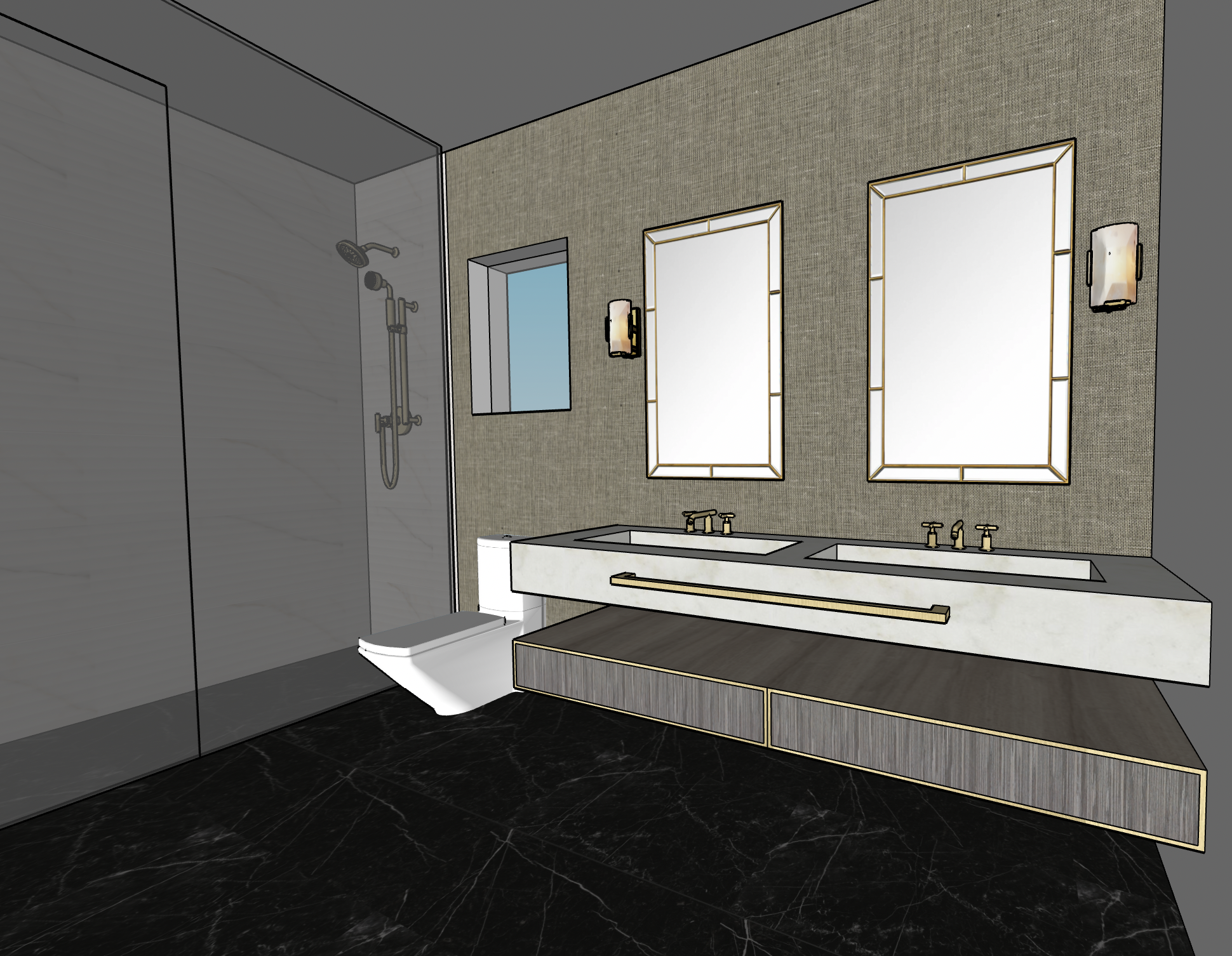 make floors black marble and the shower walls a soft calacatta gold marble the wall behind the vanity is a beige charcoal textured wallpaper