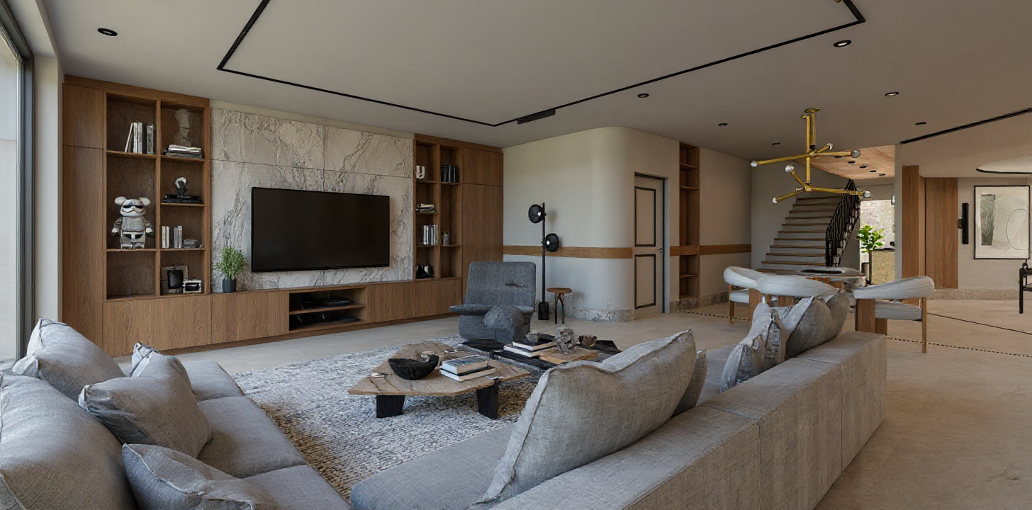 create a beautifully rendered modern living area use a soft warm color palette with ecru matte flooring the walls should be a sophisticated light grey and the cabinetry in ecru with wood accents keep concave panels on tv back wall incorporate black metal accents in the furniture and fixtures for a chic contrast ensure the atmosphere feels inviting and cozy with soft lighting to enhance the warm homely ambiance keep all original color of materials add subtle sunlight turn on lights add lights on tv cabinet shelves