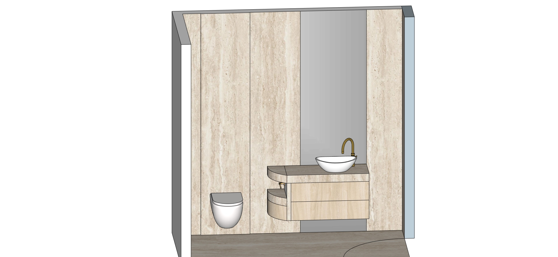 use the uploaded 3d model as the base maintain the existing geometry layout and overall structure of the space do not redesign or alter core elements the wall that the toilet is mounted on should remain as shown with a subtle 10mm outset from the surrounding wall matching the reference image this should read as a clean architectural detail keep the toilet roll holder in its exact current position enhance the scene into a bold high end moody powder room with strong visual impact lighting introduce bold but refined led lighting the outset travertine wall behind the toilet should have a concealed led strip behind it creating a soft halo glow add a lit mirror with integrated lighting that emits a soft diffused light overall lighting should be minimal but impactful soft shadows no harsh glare controlled ambient atmosphere materials coastal aesthetic with calm warm oak tones travertine stone as a key feature textured natural warm gold tapware and subtle gold accents rims trims keep materials elegant and restrained with realistic texture depth and subtle reflections styling add minimal high end objects e g small decor folded towels refined accessories to elevate realism but keep the space uncluttered and intentional camera you may slightly adjust the angle only if necessary to better showcase the space lighting and feature wall but keep the composition close to the original use the reference images for lighting mood shadow softness and material realism overall feel modern coastal minimal moody and elevated the space should feel refined atmospheric and visually striking a true statement powder room