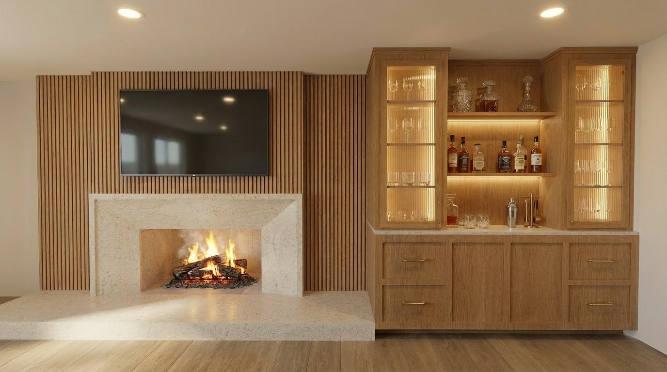 wooded north carolina background outside afternoon light cabinet and dark walls are clad in blackened steel panels with minimal surface flaws