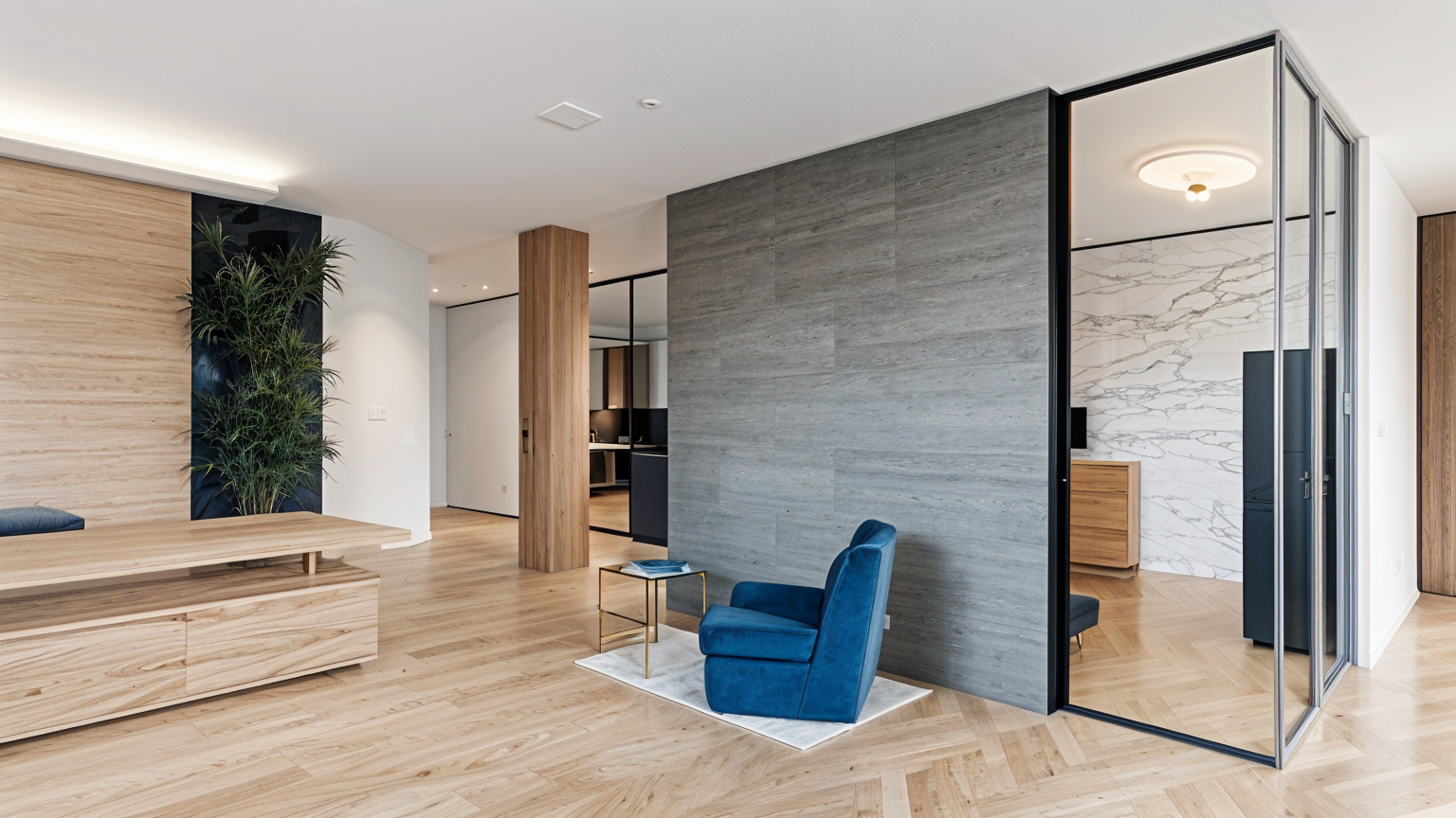interior shot render a modern office space with a sleek minimalistic design the walls are a soft light gray and the carpet is a darker gray creating a calm professional atmosphere the desk is a rich dark wood with neatly arranged stacks of books and elegant d cor include two mesh office chairs in a deep charcoal color add a stylish black desk lamp next to a vibrant bouquet of orange flowers and a potted plant in white for a touch of nature display a computer on the desk with the screen facing forward incorporate a few curved modern vases in blue and gray above the desk in elegant black lettering write best auto the lighting is warm and ambient casting gentle shadows across the room architecture