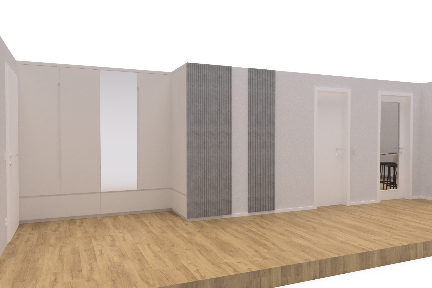 improve the realism of the provided interior render while strictly preserving the original composition and architectural intent strict rules must follow do not change camera framing proportions or geometrydo not add remove or redesign any elementsdo not introduce any new light sourcesdo not add led strips hidden lighting cove lighting or glowing ceilingsthe result must be based only on the provided imagematerial and color specifications walls light white plaster subtle texture matte finish floor natural oak wood flooring warm tone realistic grain and subtle imperfections built in wardrobes light white chalk painted finish matte soft texture decorative wall panels grey concrete panels fine texture slightly rough realistic imperfections doors light white matte finishdoor handles brushed stainless steel realistic reflections subtle roughness light switch light whitepower socket light whitelighting very important use only artificial lighting from ceiling downlights recessed spotlights light must clearly originate from downlights aboveno led strips no indirect ceiling glow no hidden lightinglight should fall naturally onto walls doors wardrobes and floorcreate realistic light cones and soft falloff from downlightstemperature neutral warm 3000 3500k add realistic shadows especially along the base of wardrobesin cornersaround door framessubtle ambient occlusion and contact shadows requiredrendering quality enhance global illumination and indirect bounce lightadd micro imperfections and realistic material response pbr improve depth and contrast while keeping a natural lookkeep the scene clean and minimal no stylization or extra elementsgoal achieve a highly realistic interior render with believable artificial lighting from downlights accurate material definition and natural shadow behavior while staying fully faithful to the original image
