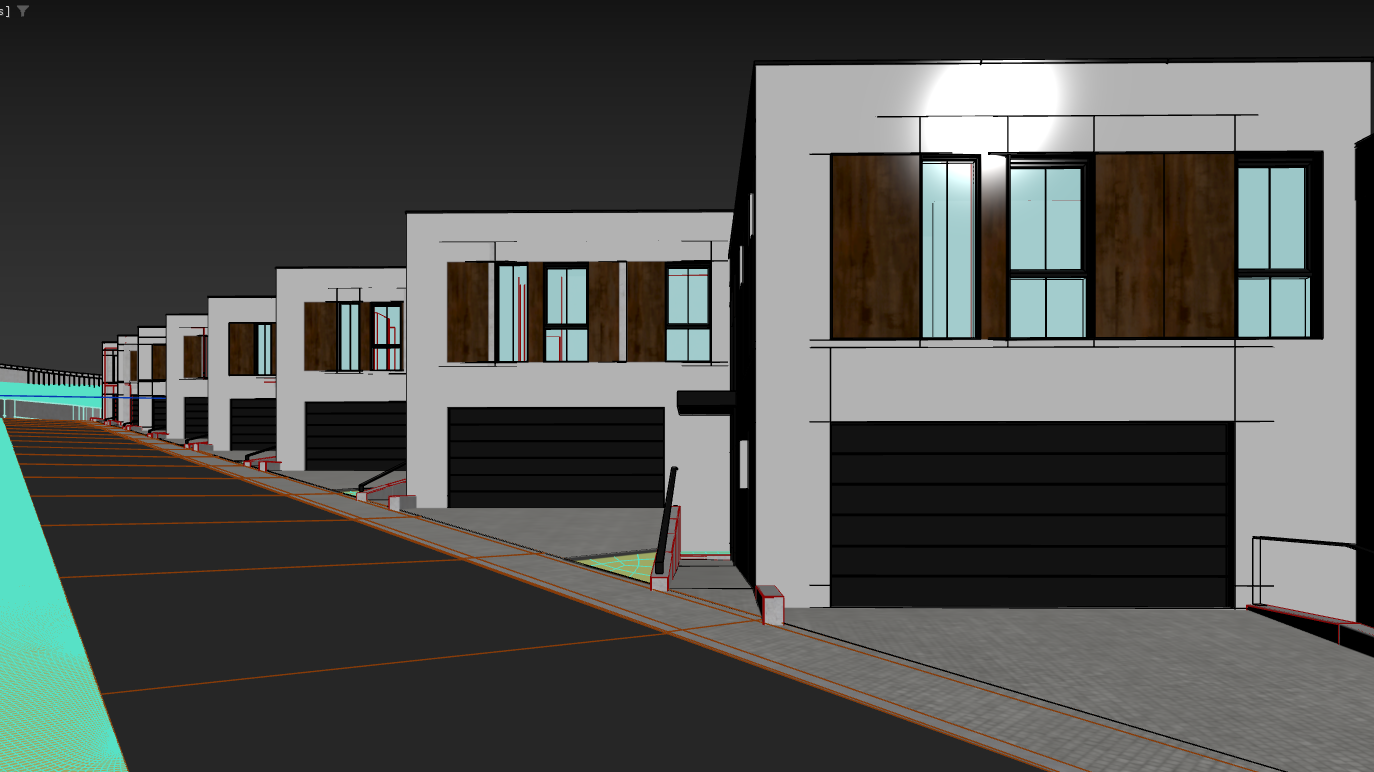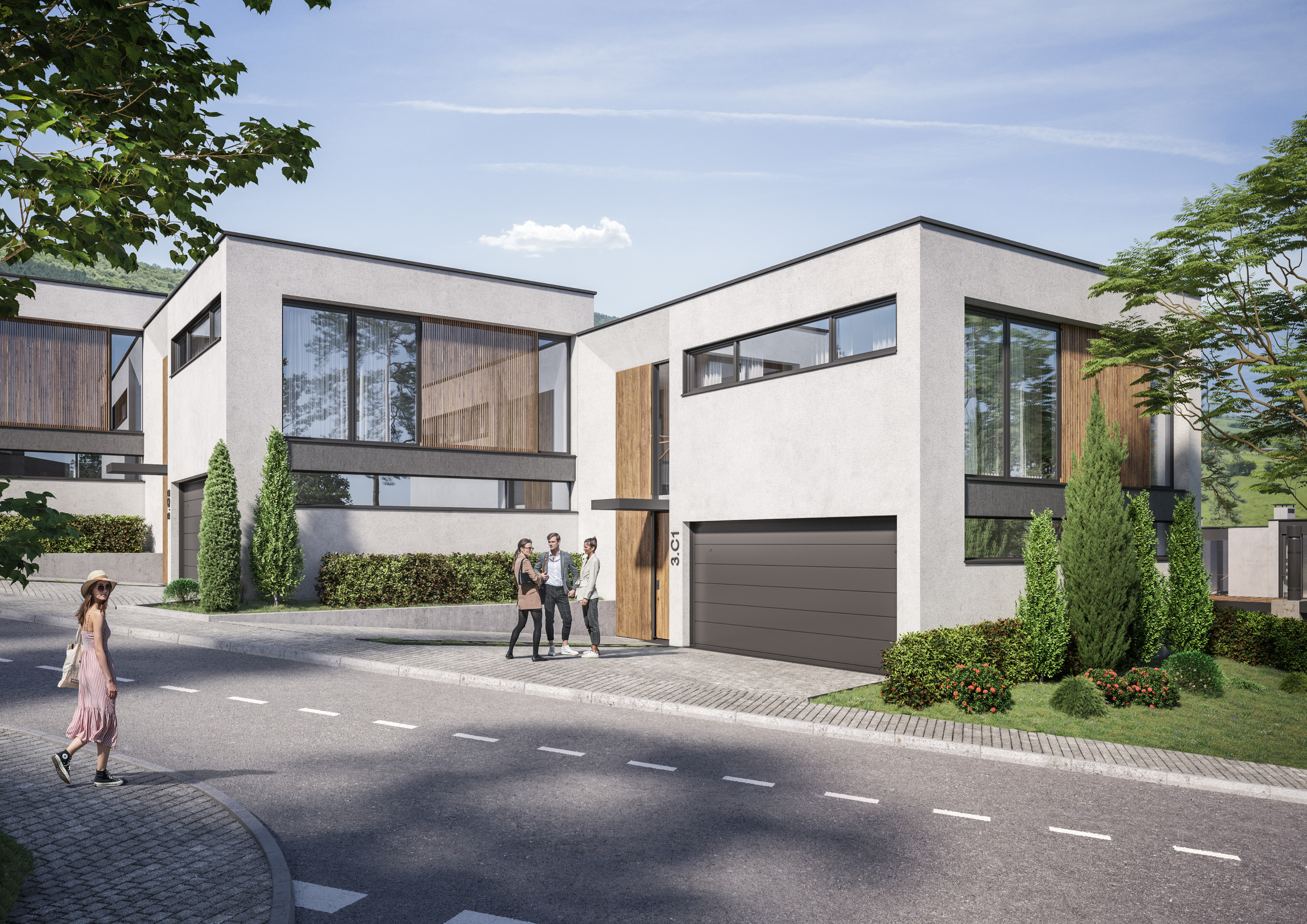 exterior shot daylight environment make brown material on the second floor corten open one of the garage doors and show two parked cars inside add some people