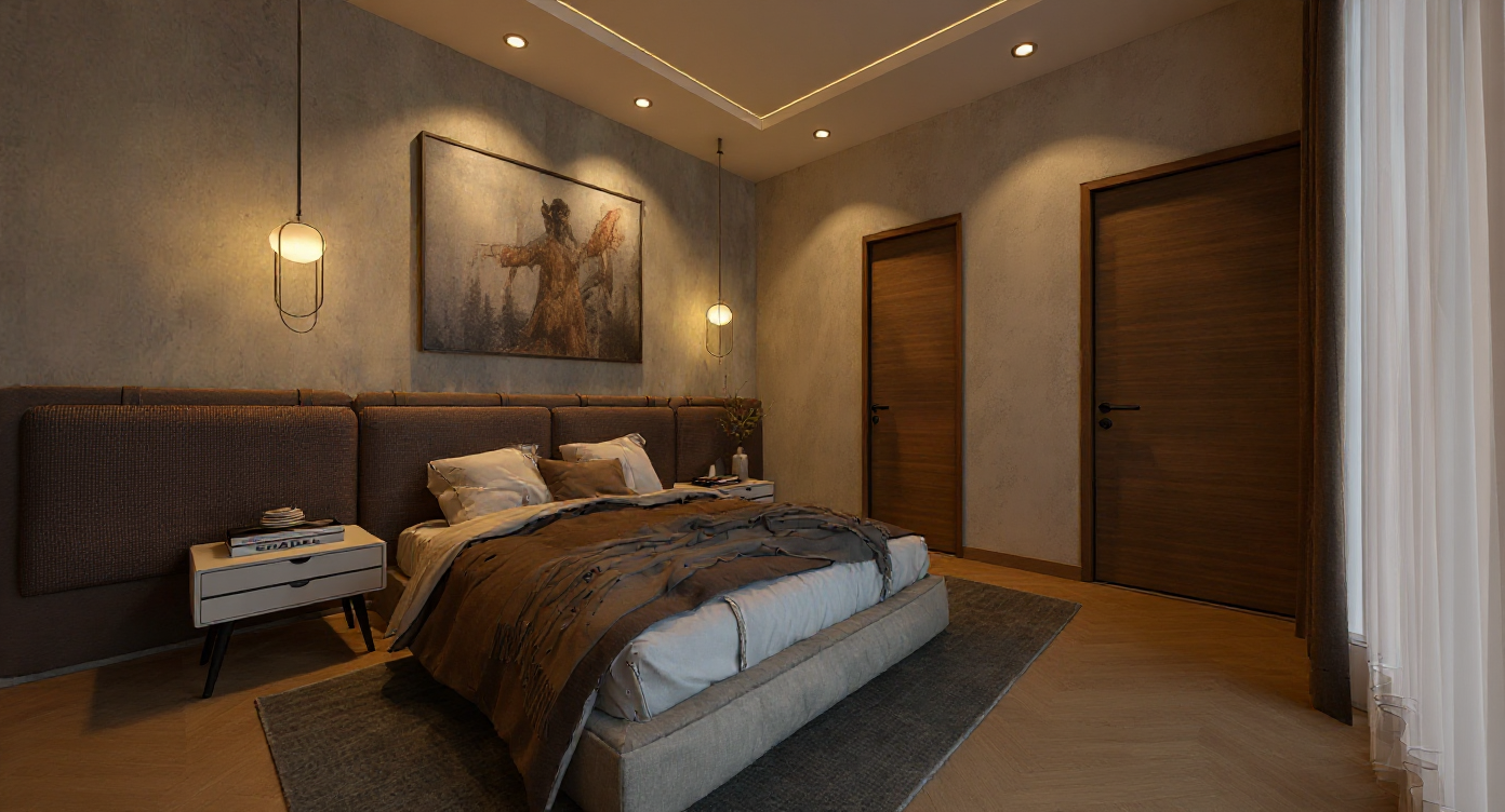 create a realistic render provide cove lights and illumination for the light fixtures add artwork in the headboard wall add mirror reflection on the mirror near the wardrobe a wooden door is to be seen in the mirror reflection