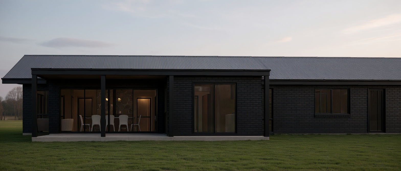 minimalism exterior shot black siding architecture no background houses metal roof natural stone wall