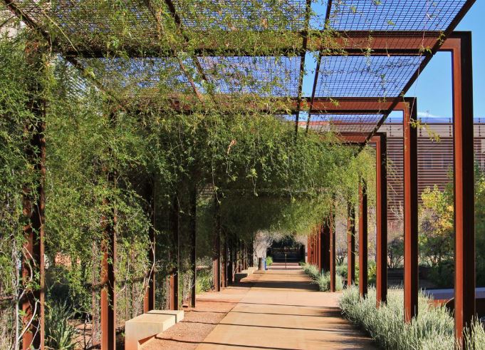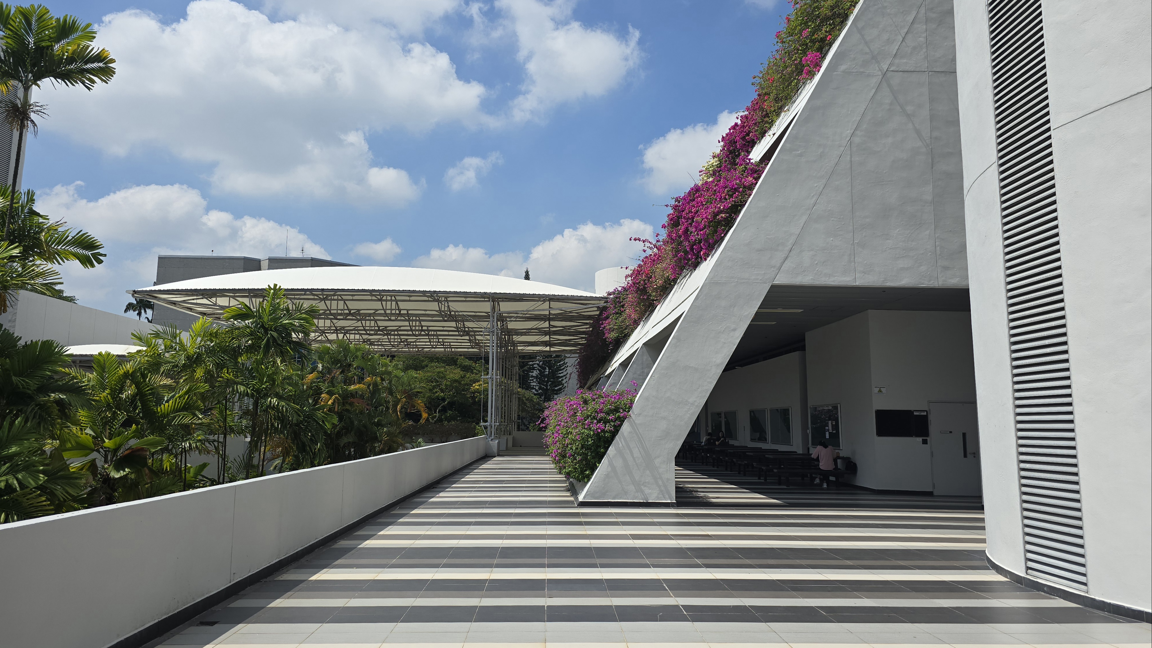 exterior shot add pvc fabric canopy trellis sheltered linkway along outdoor corridor do not touch the building facade do not touch the void