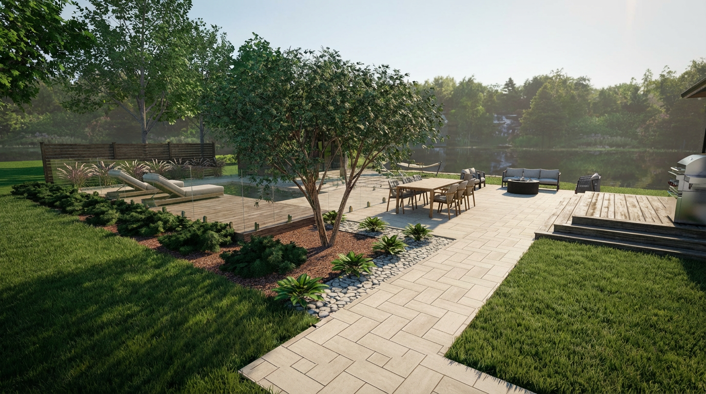 a photorealistic highly detailed architectural render of the exact bathroom scene from image 0 png the spatial geometry object placement and all architectural features remain strictly identical to image 0 png lighting is soft directional daylight from an off camera source to the left casting natural gradients and realistic soft shadows absolutely no new windows light openings or structural changes are added textures are physically accurate raw formed concrete panels with aggregate and formwork lines on the left wall natural oak wood grain on the steps door rustic column and bench detailed individual geometric patterned ceramic floor tiles clear glass shower enclosure matte black metal towel radiator realistic textile weave on the specific striped and folded towels the landscape wallpaper maintains its grey tone and pattern all lines are clean and defined removing the sketch style ultra high resolution 8k
