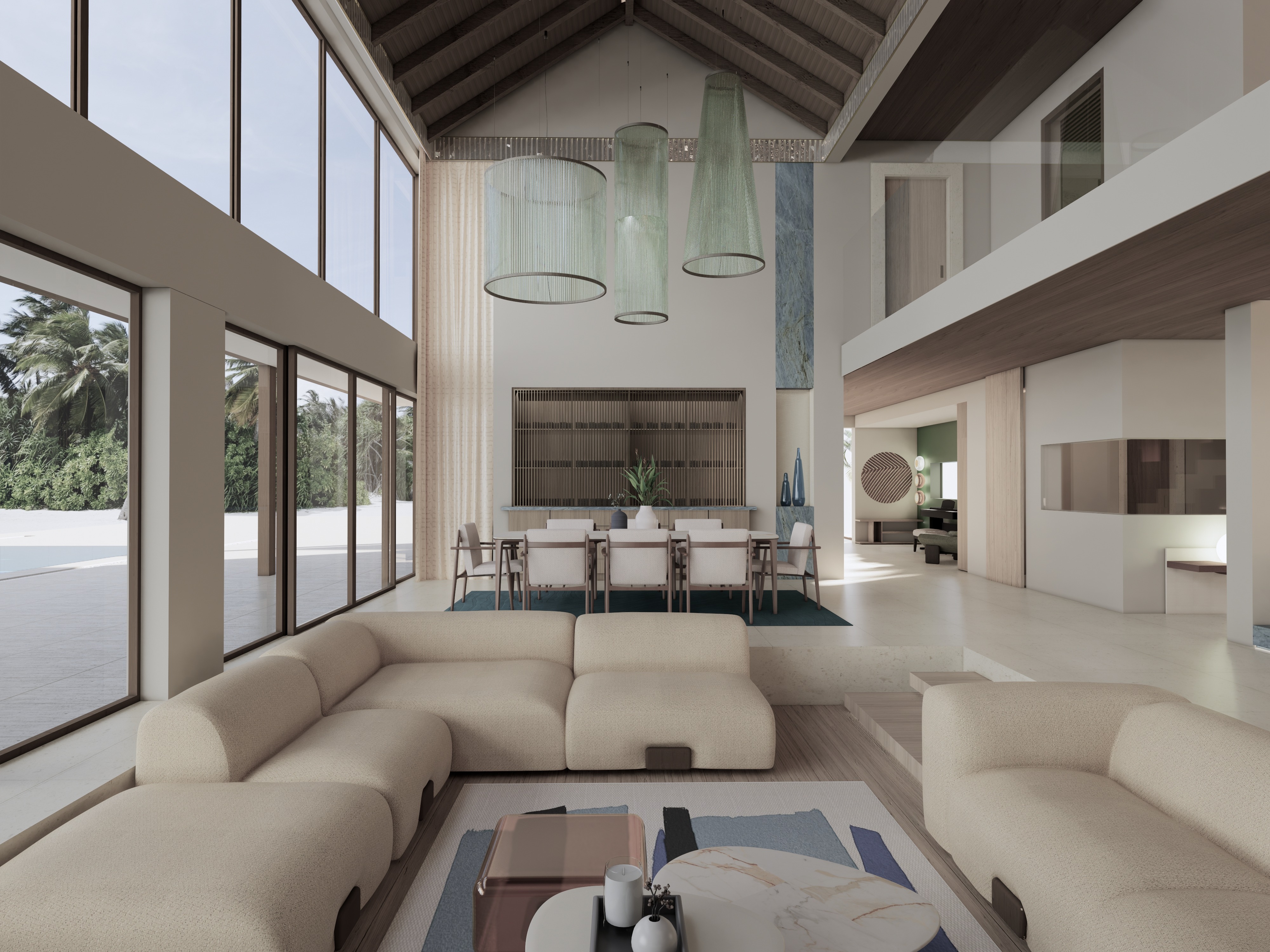 modern minimalist interior spacious room with a calming atmosphere highlight a dark green accent wall featuring a sleek modern piano and a cozy chair include light wooden shelves and a decorative circular wooden wall piece incorporate soft natural light streaming through a horizontal window with a view of lush palm trees the ceiling should be a light wooden texture with large smooth cream colored floor tiles set the mood with a blend of nature and tranquility