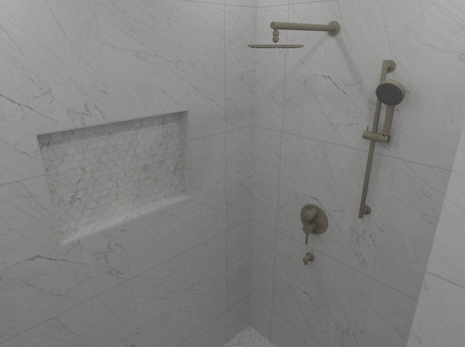 luxury bathroom with accessories in shower niche