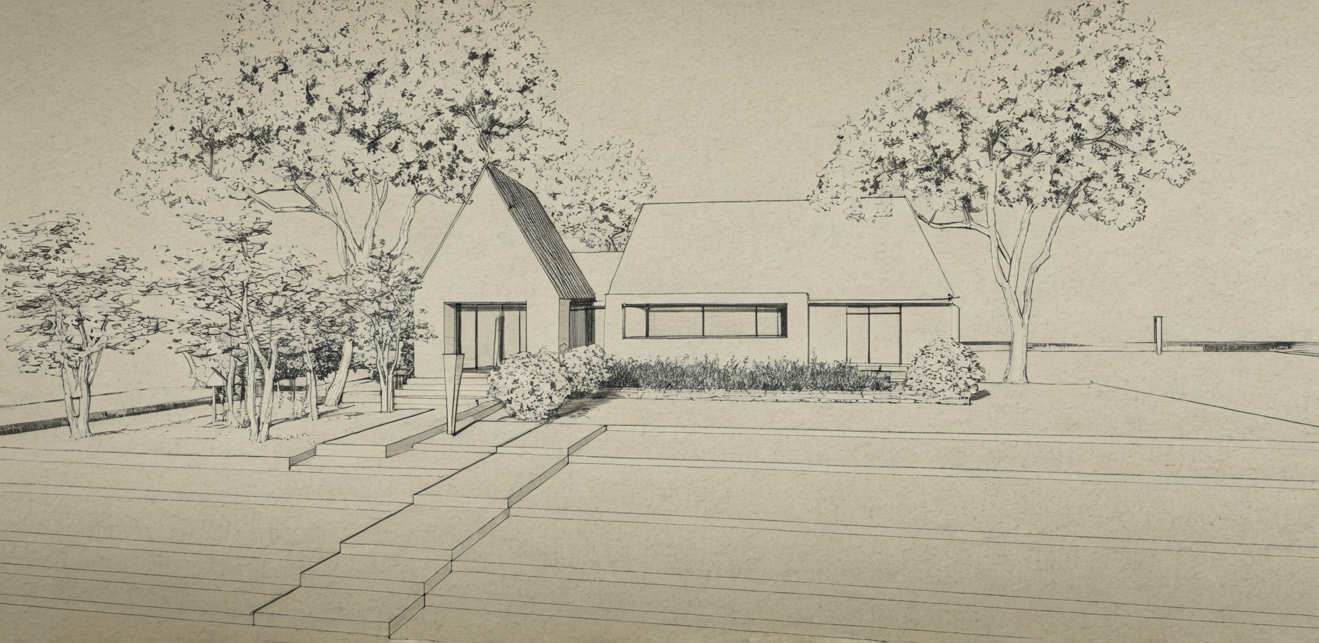 modern minimalist house in a serene landscape surrounded by lush green trees with vibrant foliage the house has a warm earthy black tone brick exterior a sleek black roof and large glass windows reflecting sunlight the sky is a clear blue casting a soft natural light over the scene the garden is filled with a variety of green plants and bushes creating a peaceful and inviting atmosphere pathways are smooth grey stone complementing the natural setting