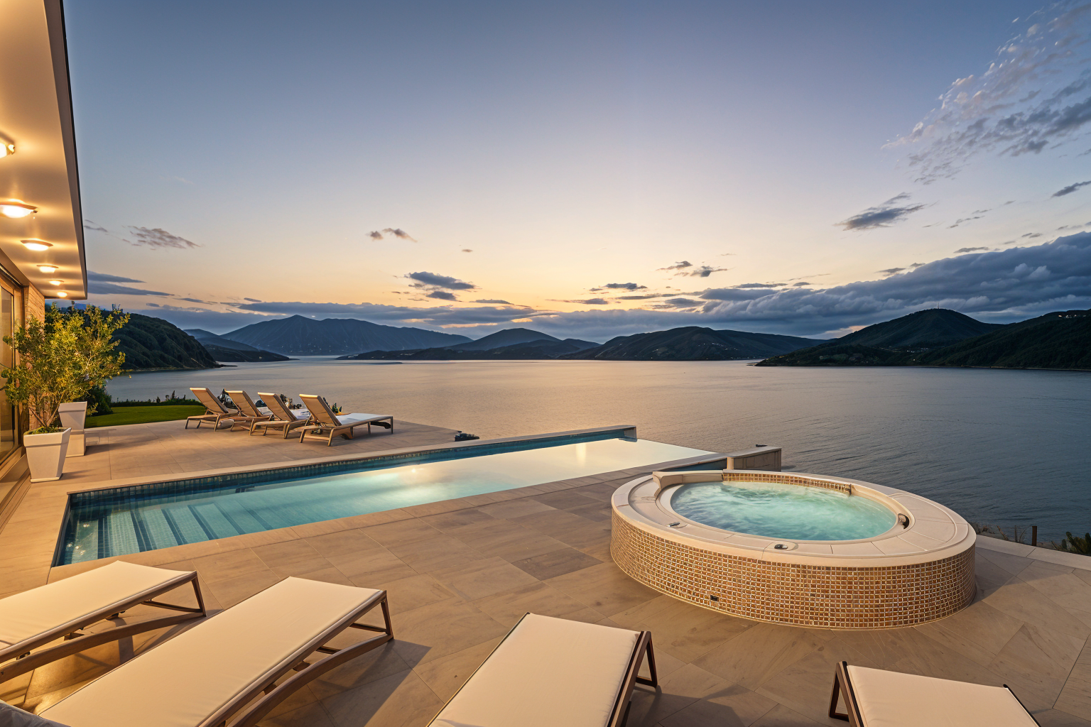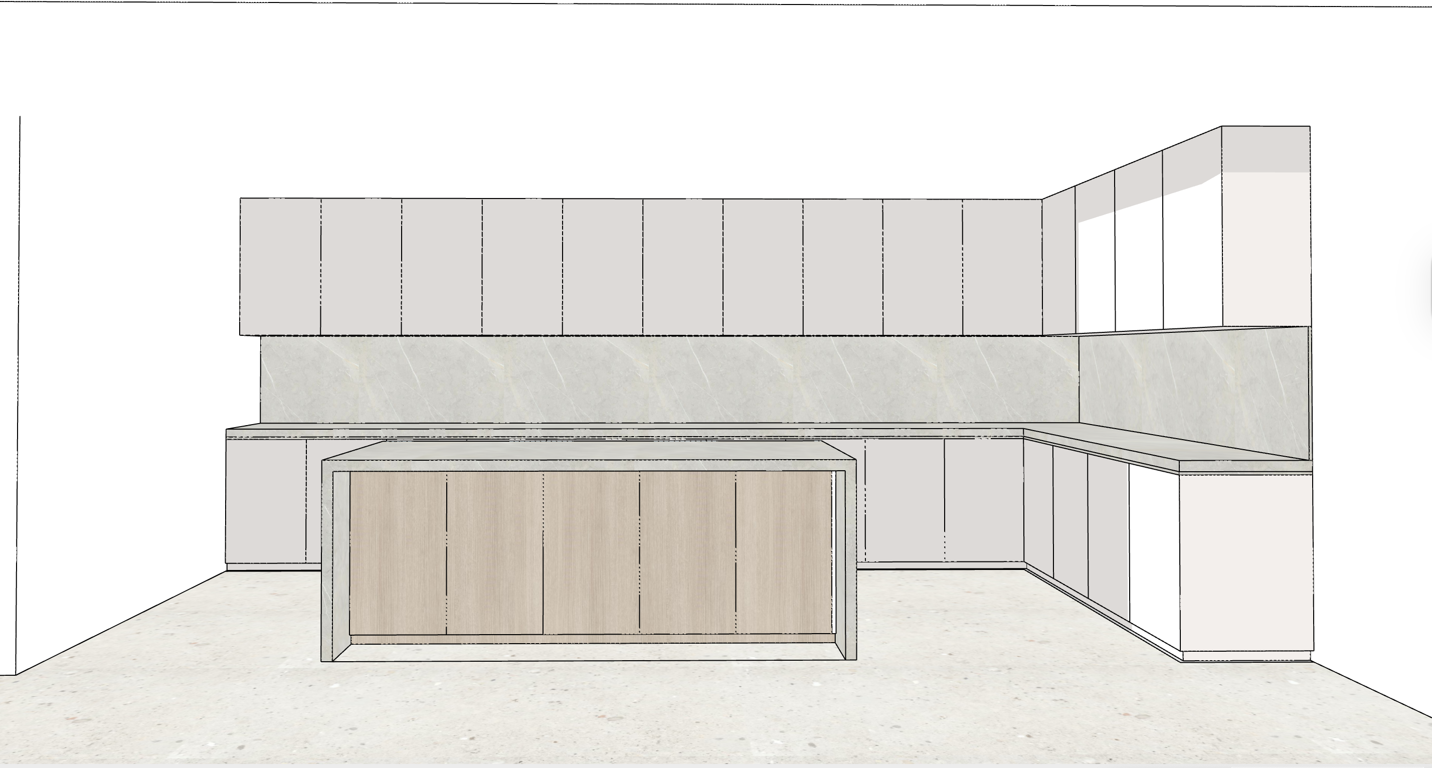 photorealistic modern minimalist kitchen interior warm natural daylight coming from a large sliding glass door on the right side soft afternoon sun with gentle shadows matte beige handleless cabinets with clean flat panels light oak wood accents on the island base marble countertop and marble backsplash with subtle grey veining large kitchen island with waterfall marble top integrated cooktop on the island warm led strip lighting under the upper cabinets and a soft recessed led line light above the kitchen island table area creating a cozy ambient glow neutral light stone floor tiles clean uncluttered surfaces high end architectural interior photography style realistic materials accurate reflections global illumination soft tone mapping ultra realistic 4k sharp focus natural color grading