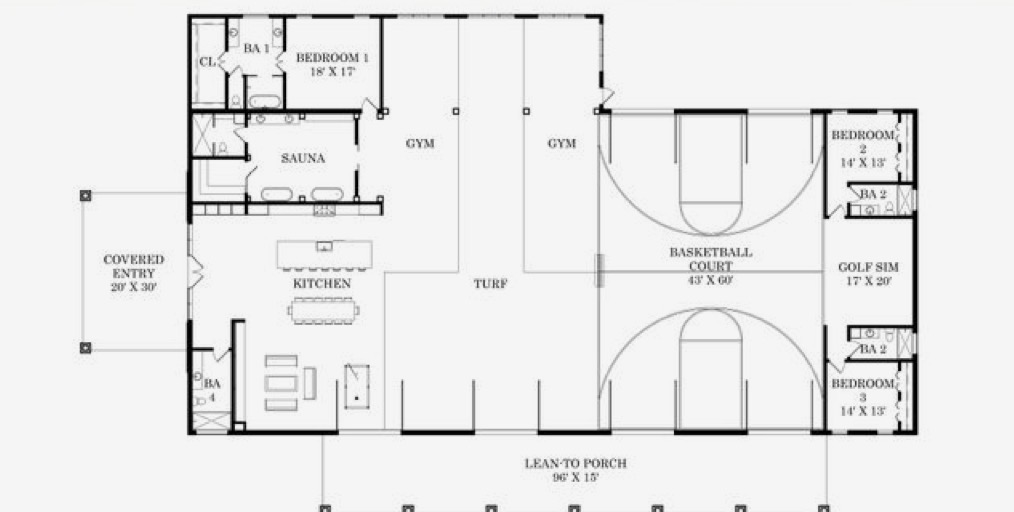 redo this floor plan with a basketball court mother in law suite sauna garages and gym architecture